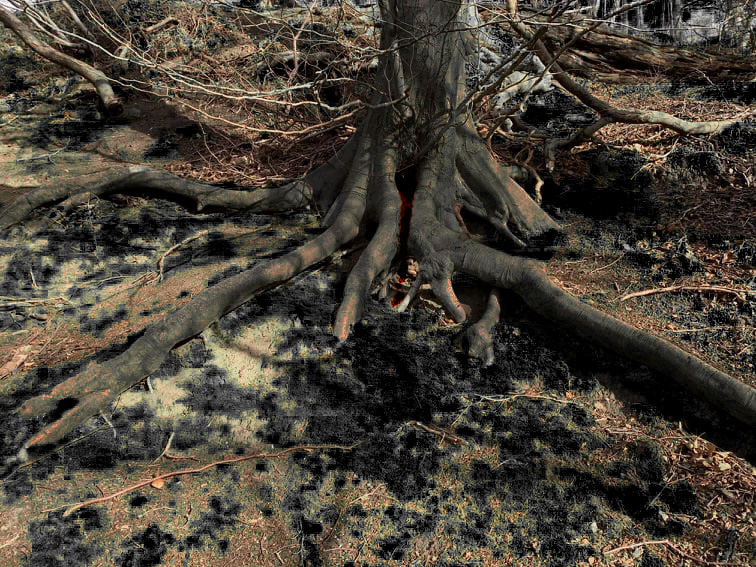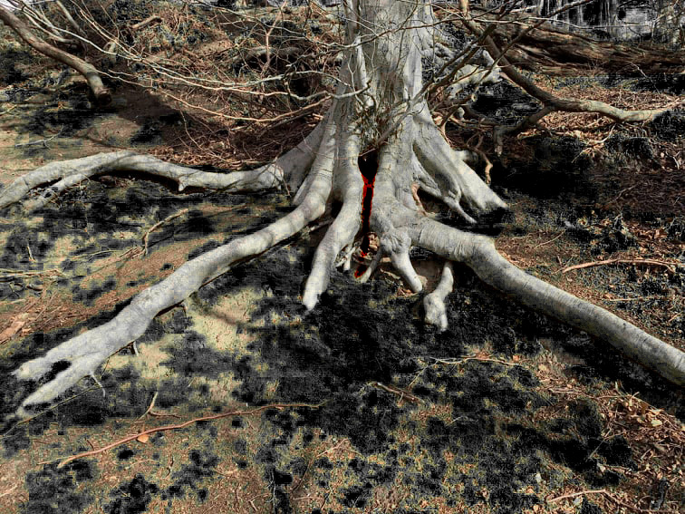 This week I edited some images from photo’s I had taken at Roslyn country park a few weeks ago.I felt inspired by a scene in Pan’s laberynth where Ofelia climbs inside the dark looking tree where a toad lives with a key in it’s mouth.Mixed with ‘The tree of the dead’ in Sleepy Hollow which of the grave of the ‘Headless horseman’ and contains the bodies of all his victims.I felt that the image of this tree would help piece together some of the story telling in regards to the main character.Prehaps this is where she was tortured and once a year the tree bleeds reminding everyone of her final resting place.The white filter on the tree was my favourite as there is a better contrast with the blood.I also altered the colour of garlic grass surrounding the tree to a black looking mould to add to the feeling of decay.