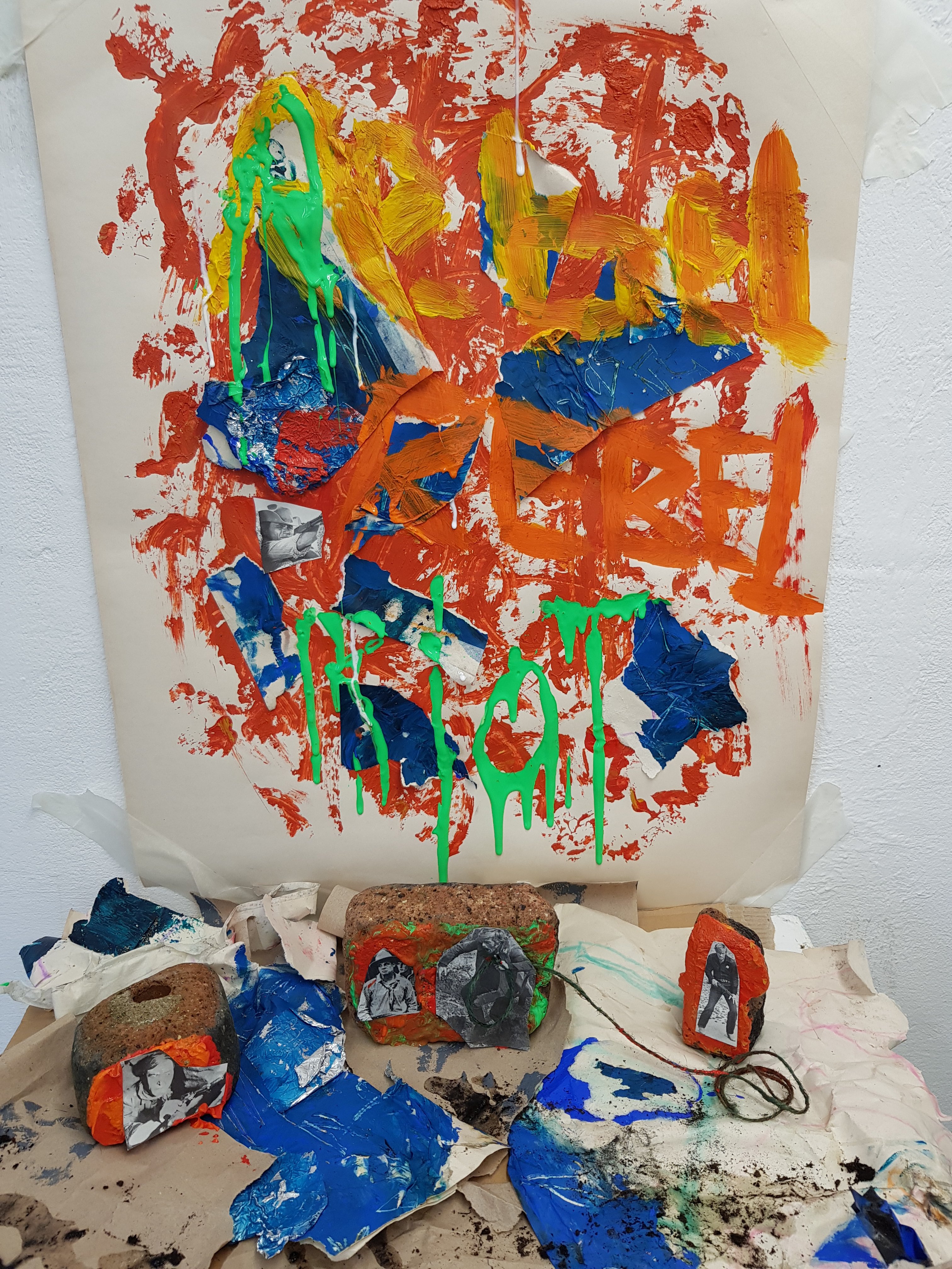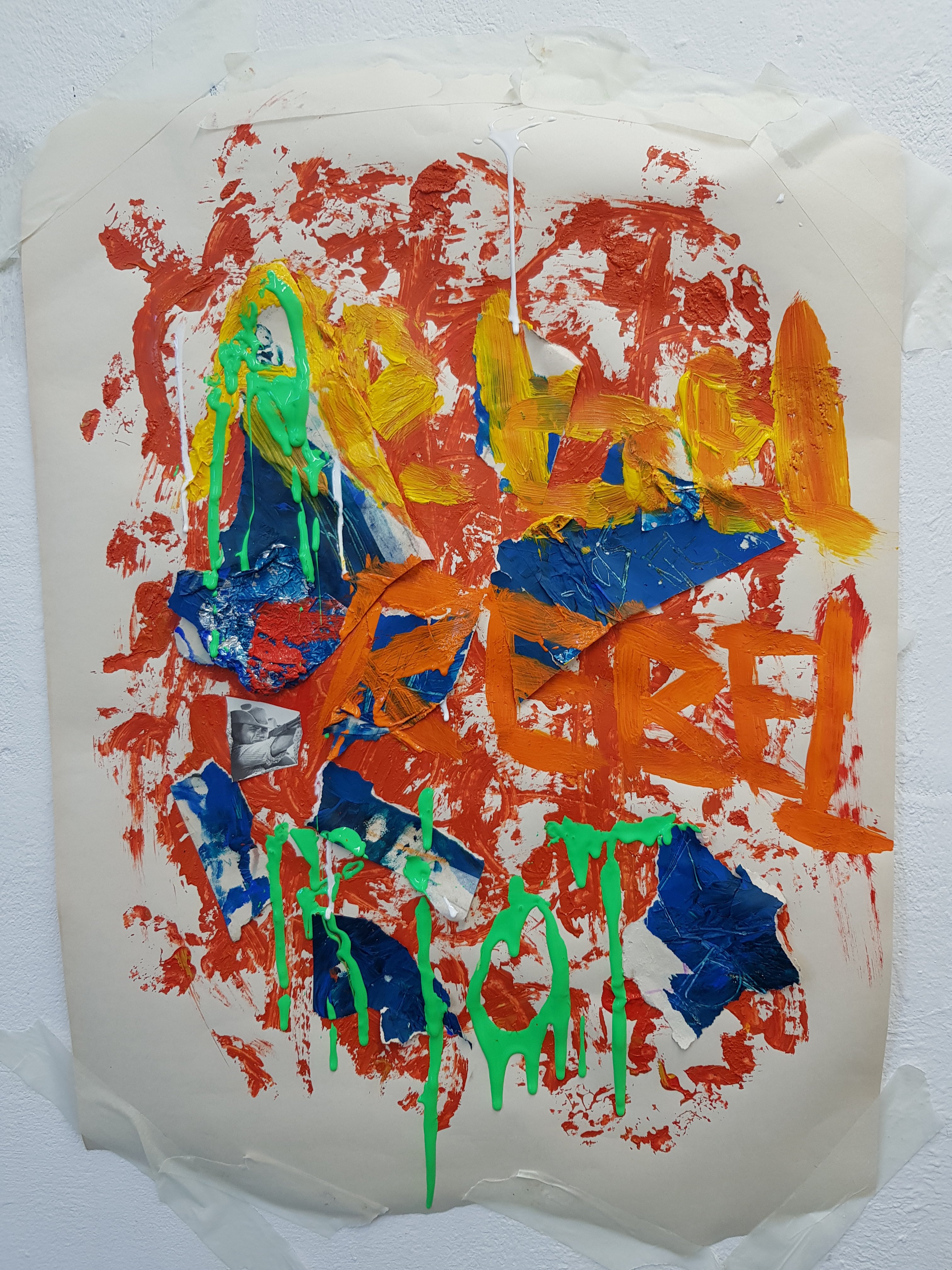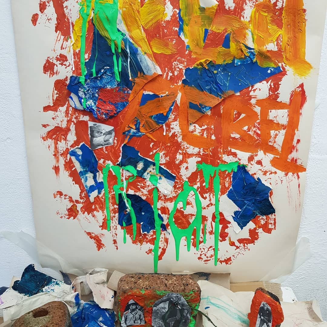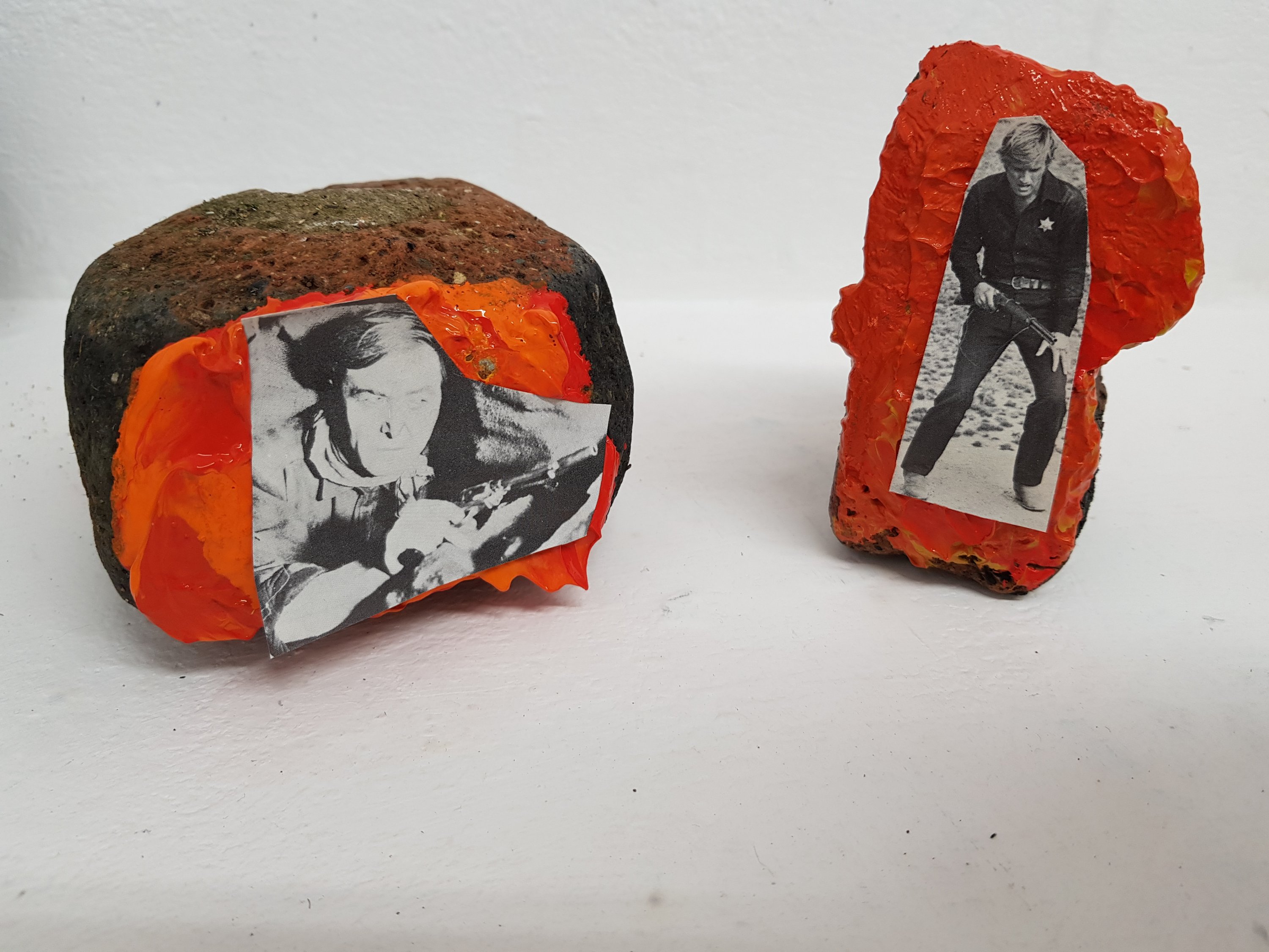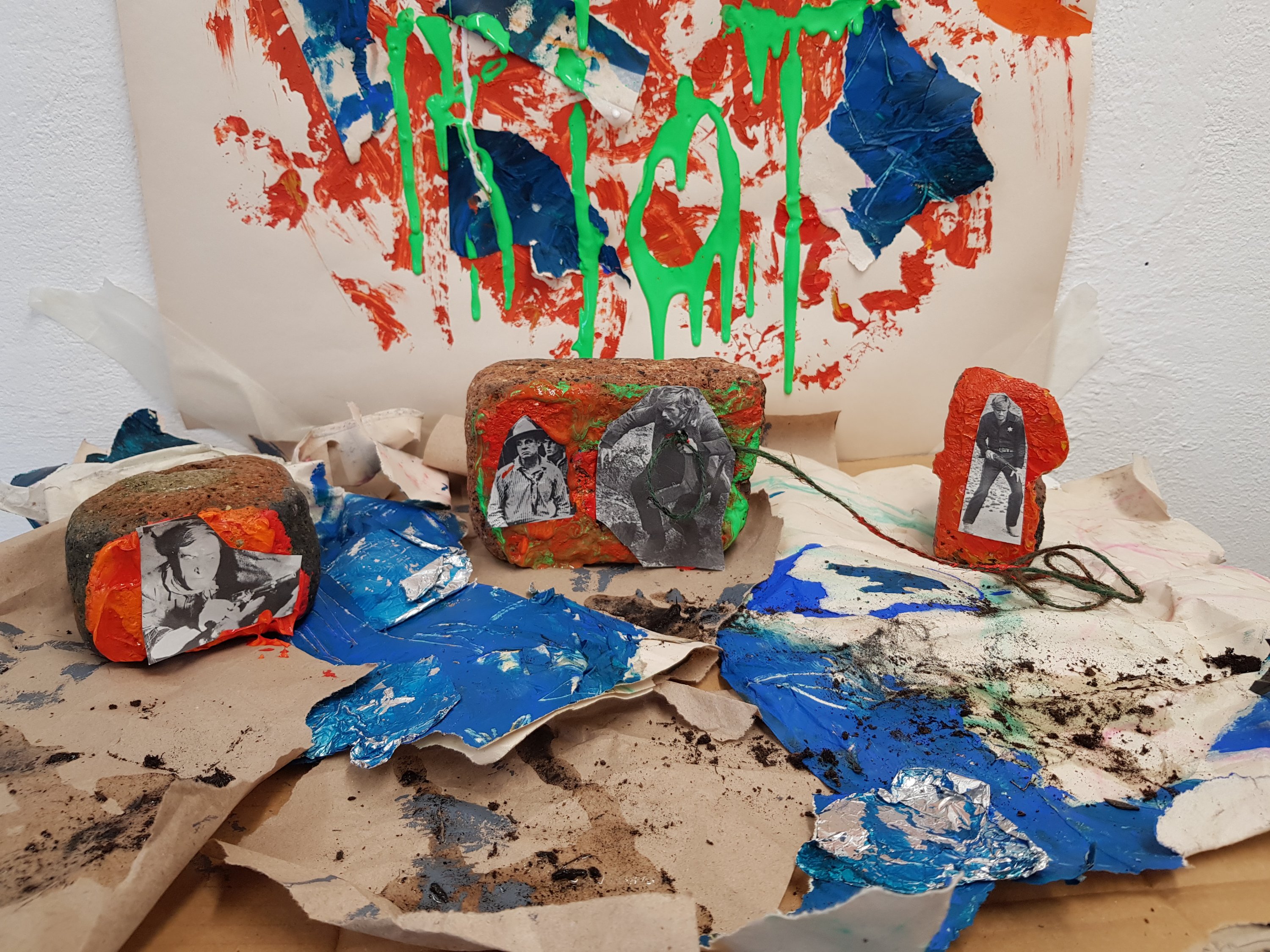 Today i had a change of heart and decided that instead of following the route I was currently on that I would re-focus on the words ‘rebel’ and ‘riot’I started to think of olden day ‘rebels’ and discovered some old magazines of bandits and cowbots.I then decided to use the contrast of modern day rebels with the olden day bandits/sherriffs.When creating the mixed media piece I used a brick to create the background texture as i felt that this was important as it tied in with ‘hooded youths rebelling/rioting during protests’ i also felt that it was important to use orange and red to create a feeling of rage/warning.I then stuck the cut out bandits/sherrifs to the bricks as i felt that this connected the old way of rebelling to the new.