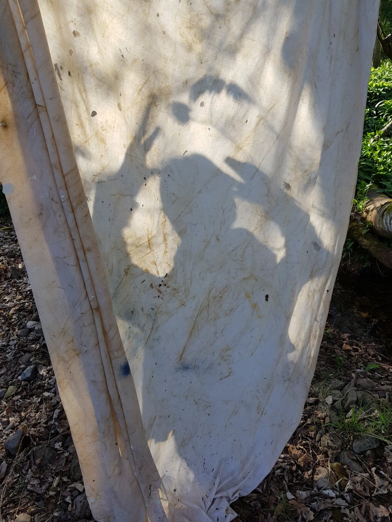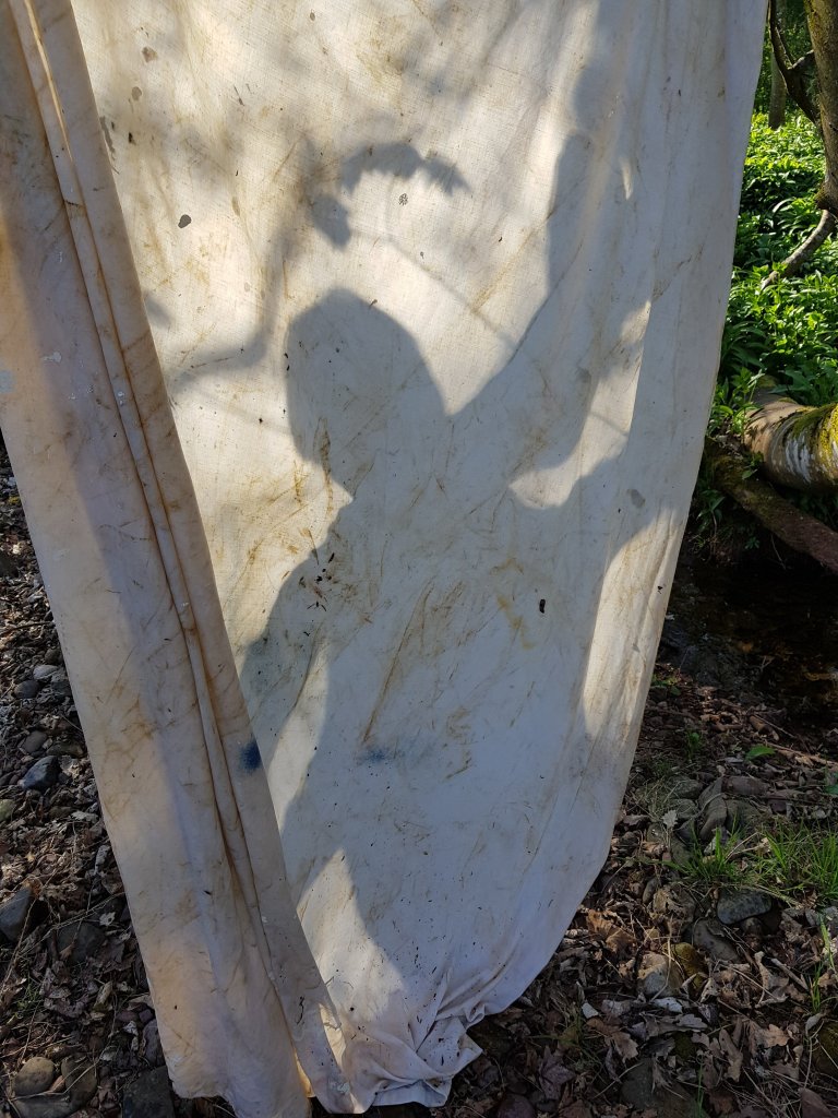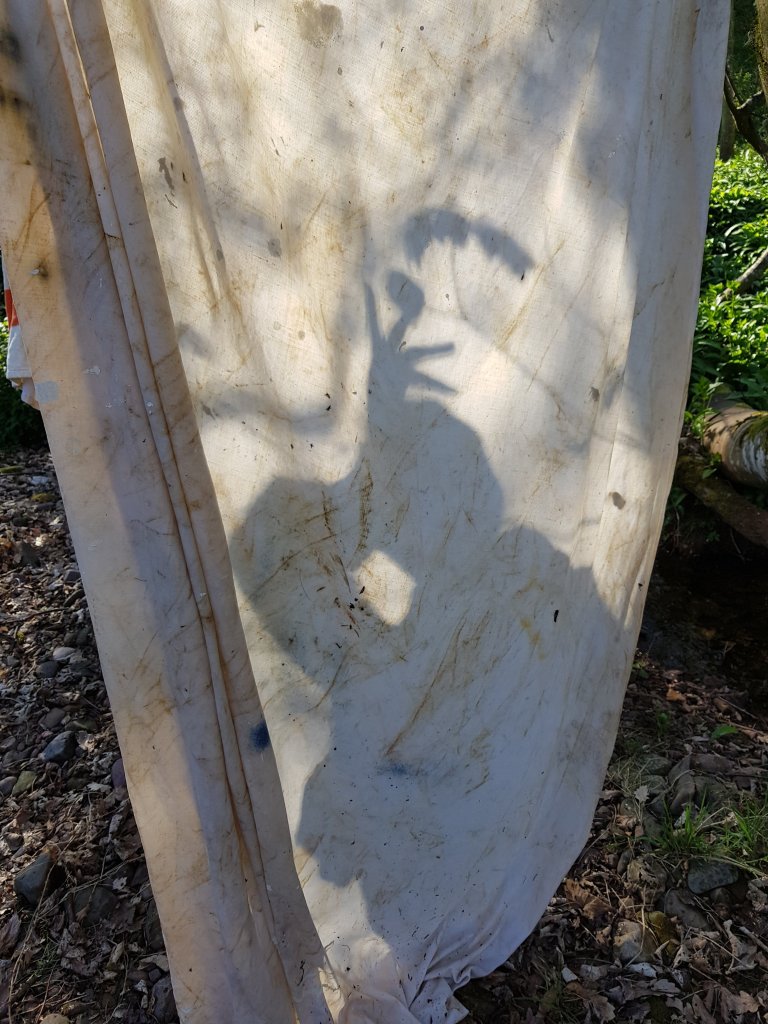 I hung the sheet to dry and very quickly realised that it created some really interesting shadows with the light projected onto it.I decided to create some child-like creative shadow figures behind the sheet.Invoking the feeling of child-like playfulness that time spent in nature gives us.