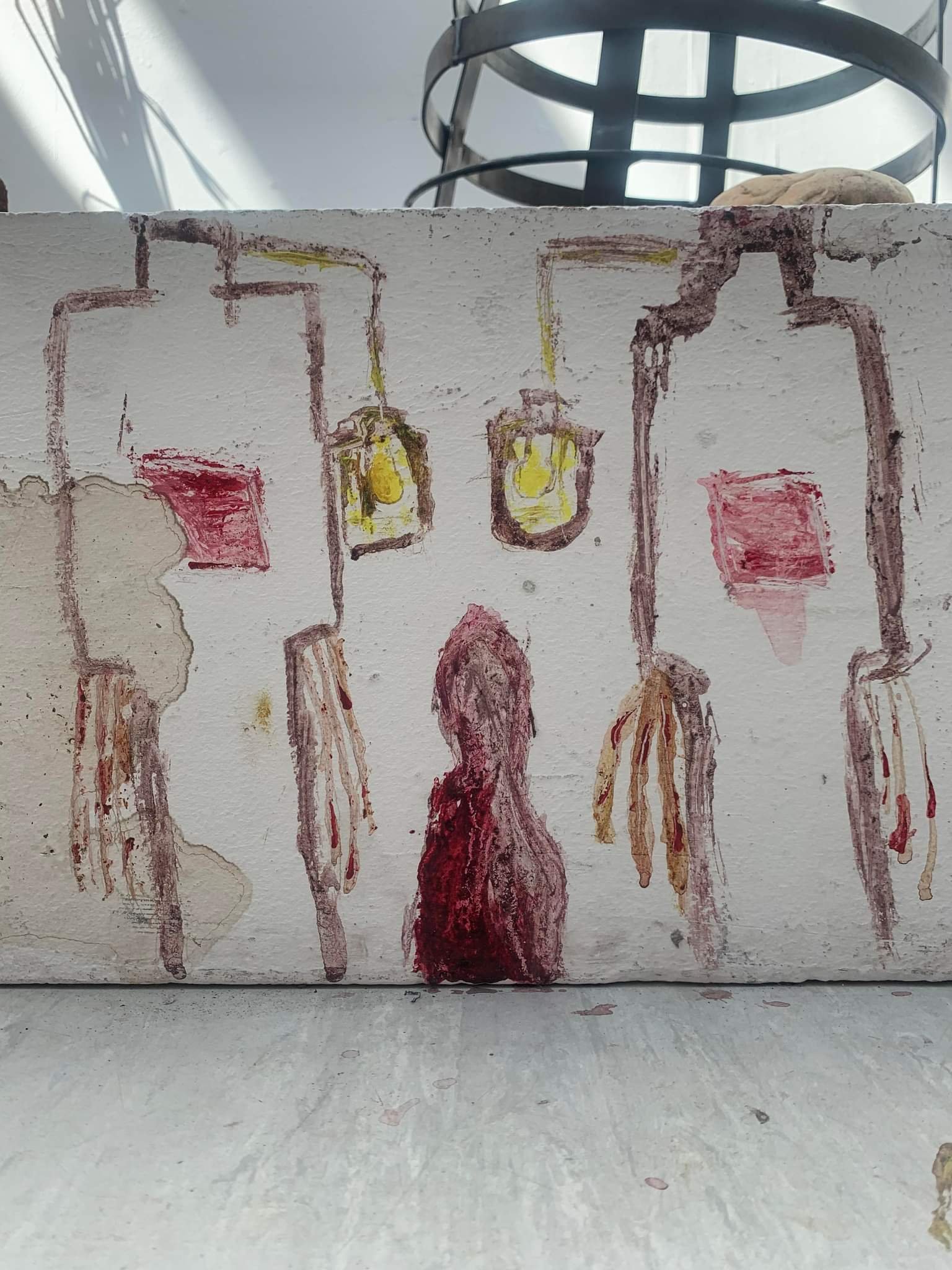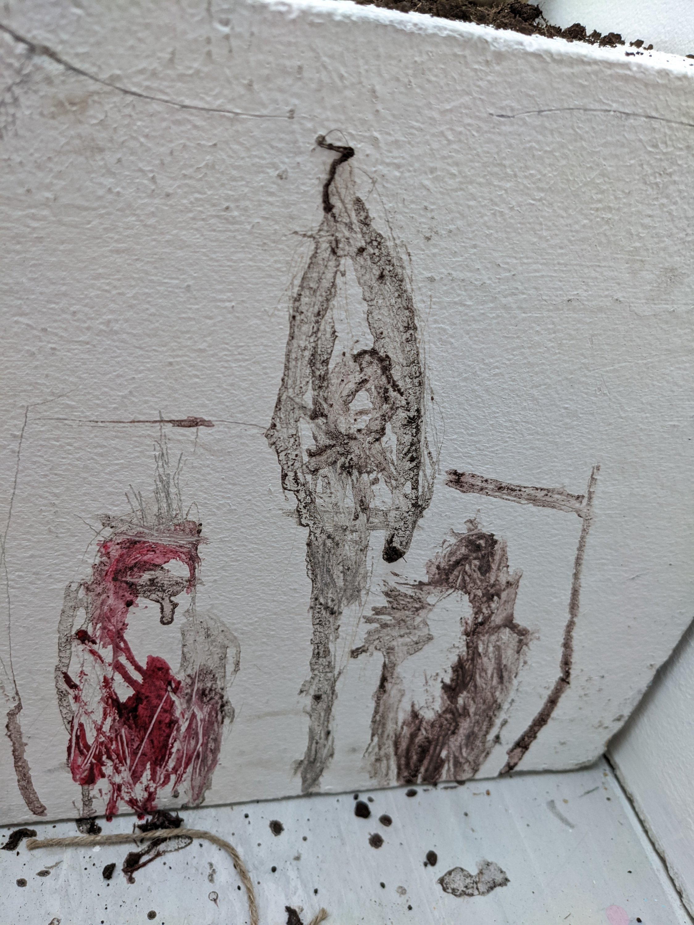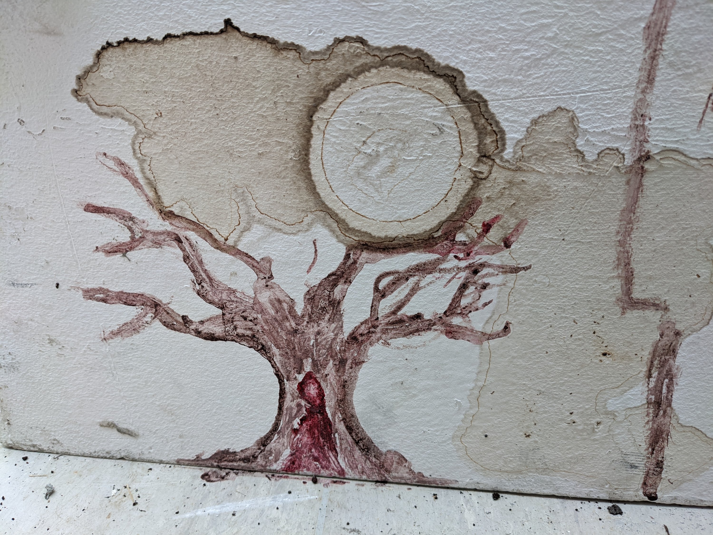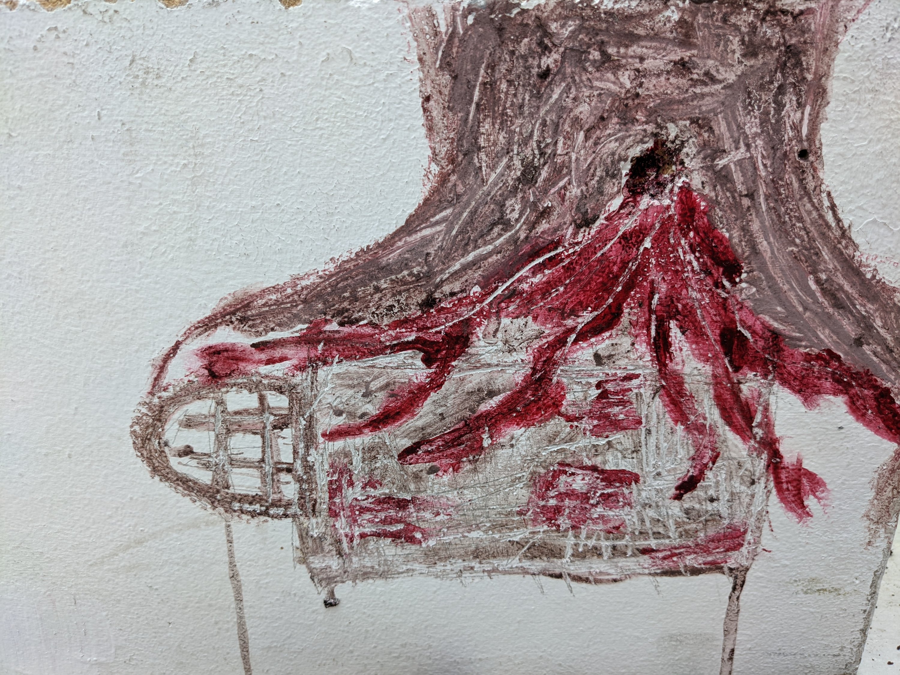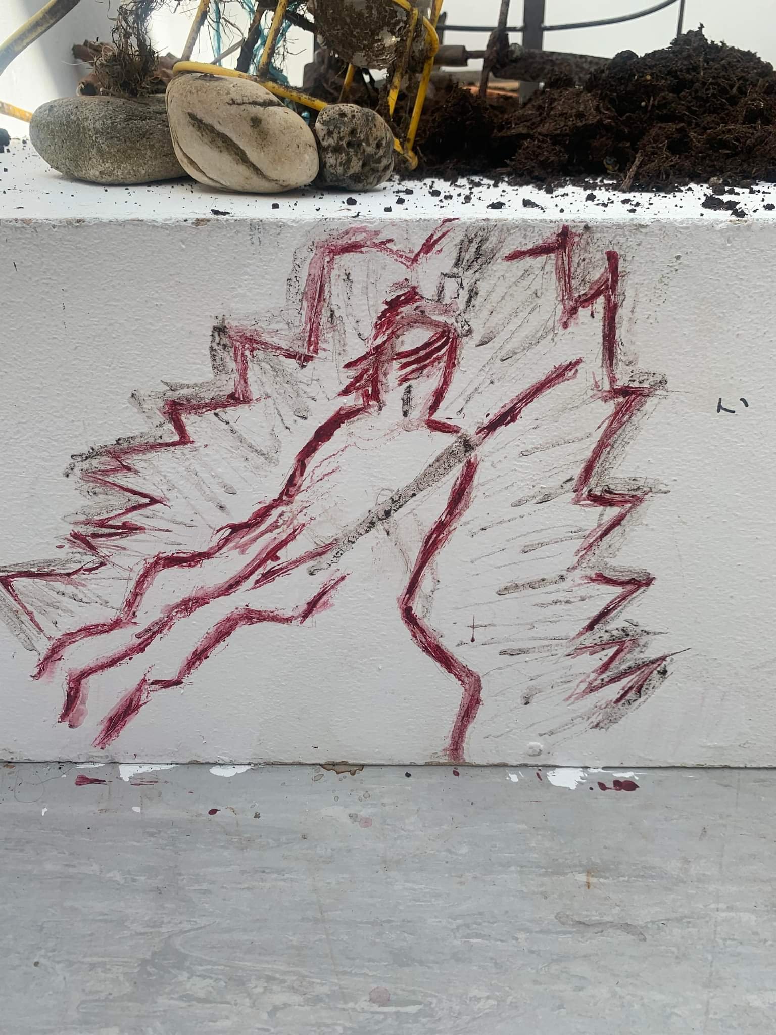 I decided to merge alot of the strong ideas together for the final assesment piece.I took Maria Fusco’s advice and filmed a performance piece where the Red Lady appears and leaves her mark and tell’s her story by making cave-like paintings.I felt that it was important to partially use natural colourings due to the Red Lady’s surrounding being the woods, so I mixed the compost used for the dig in a little water and used a mixture of sticks and an electric cable to paint the images I also mixed the red paint with compost water to give it a darker grungier tone.I also used the cable to scratch in some detail to show frustration,anger and a feeling of being on edge.It also helped with the primitive feel.
