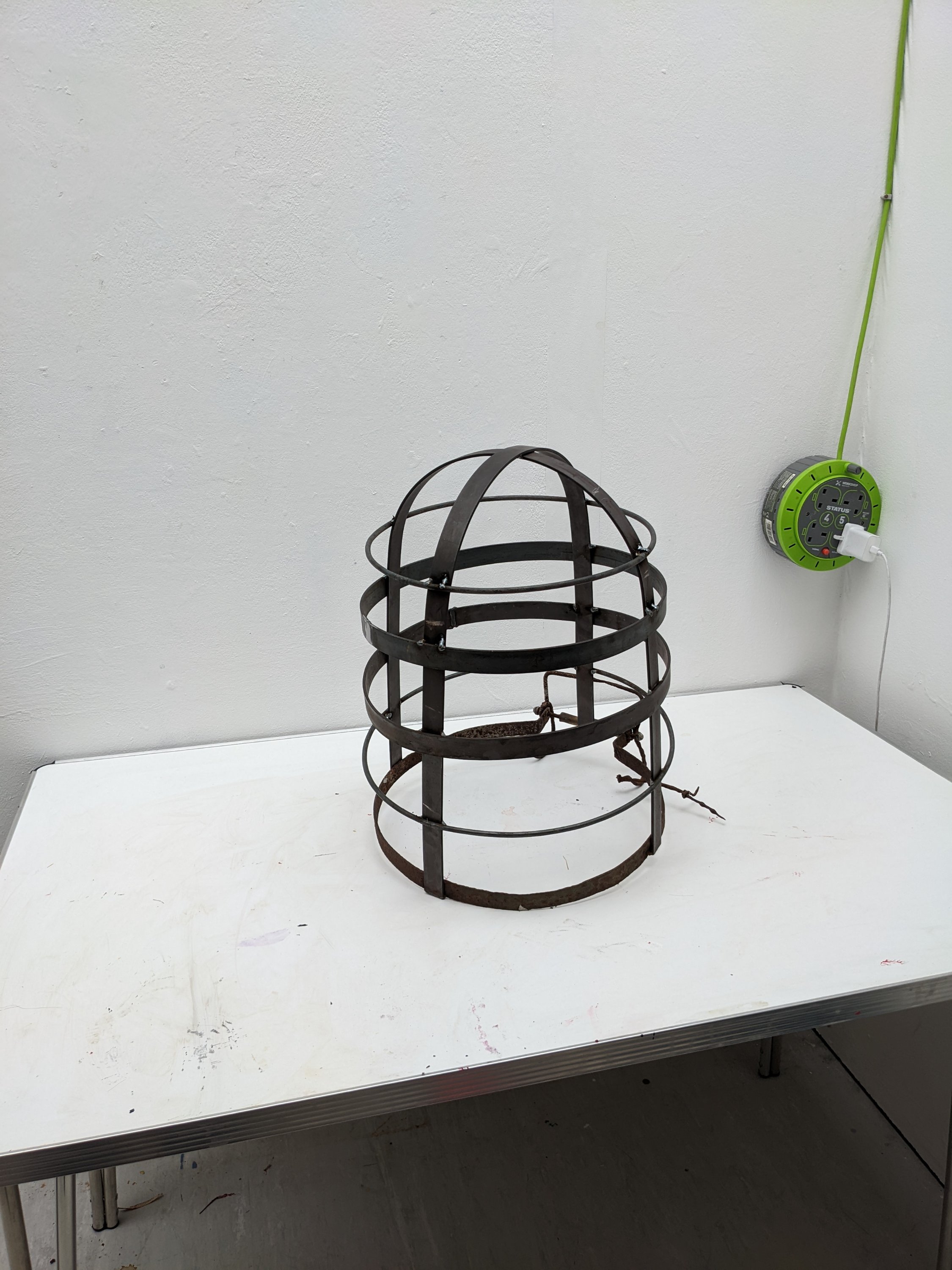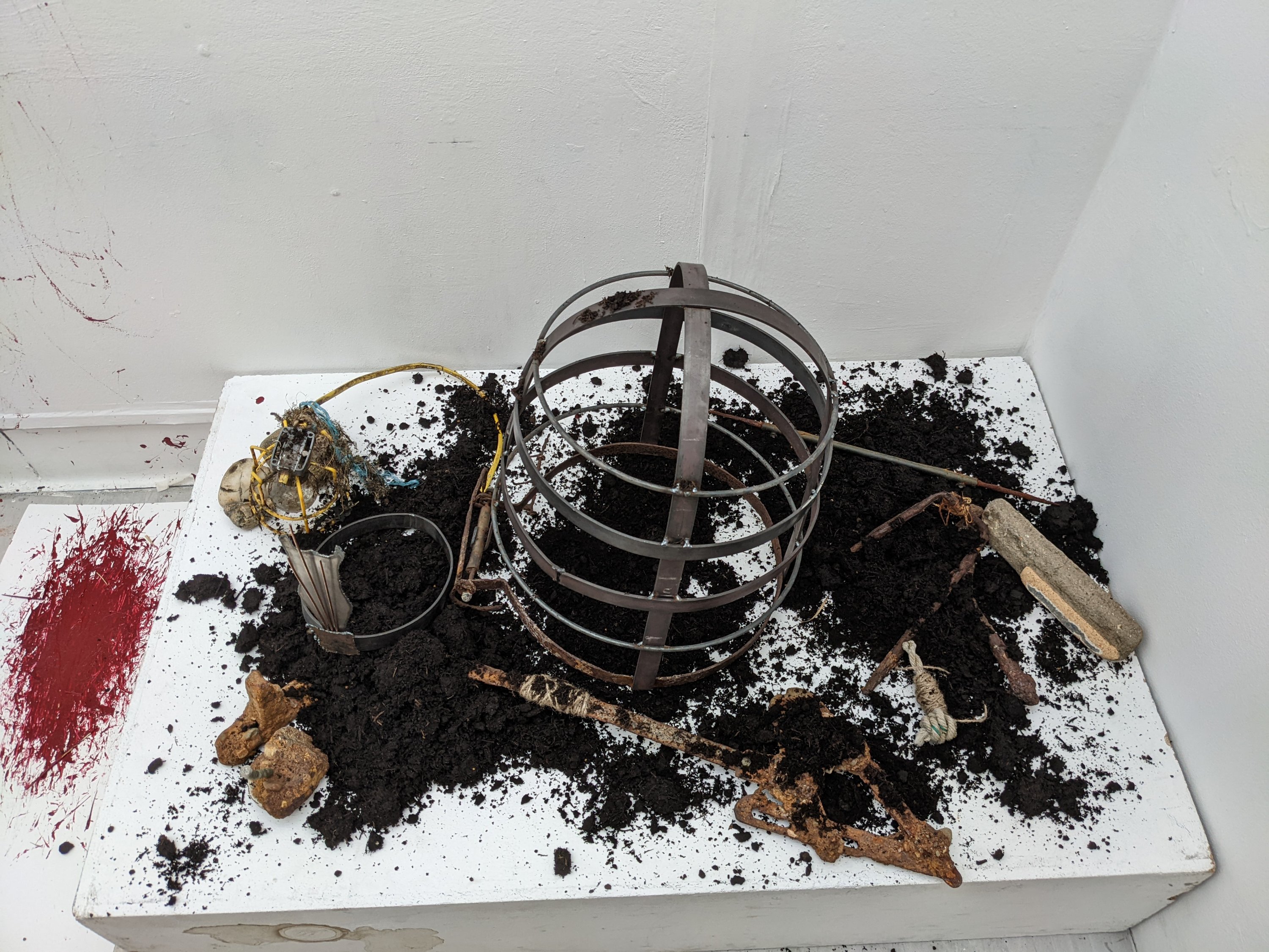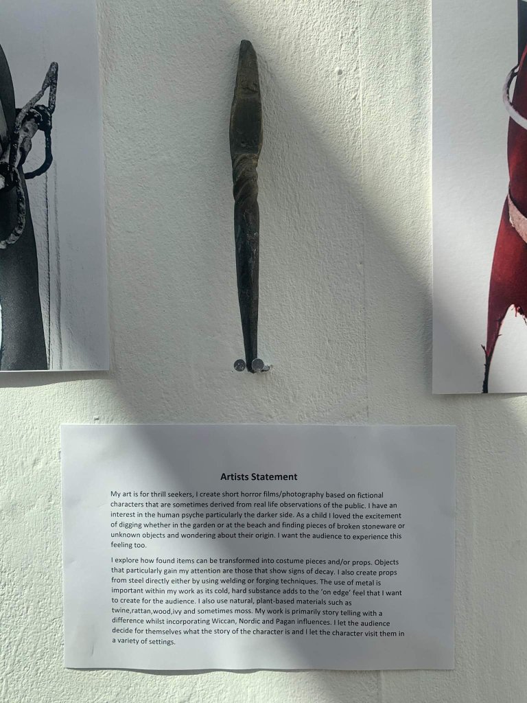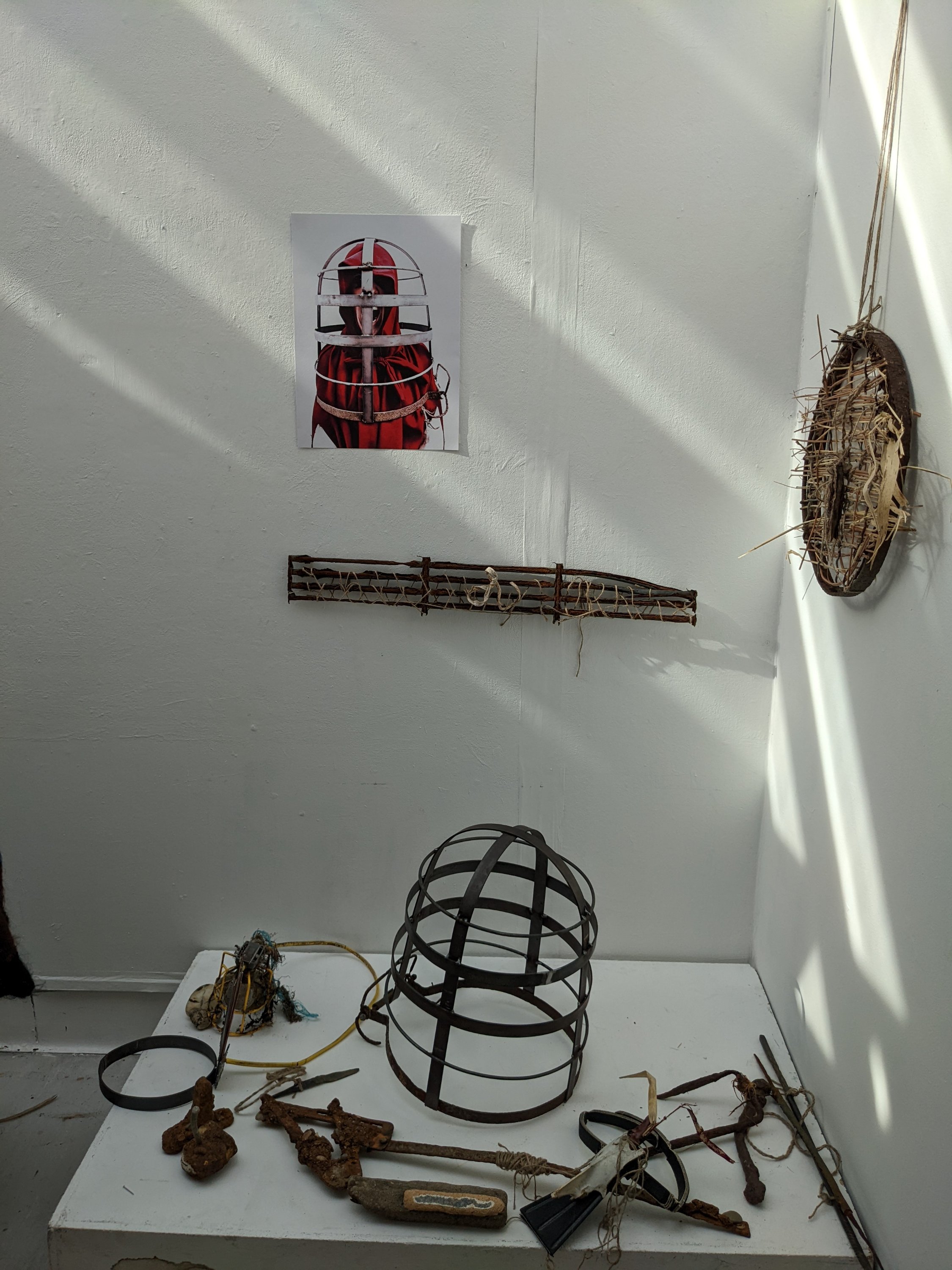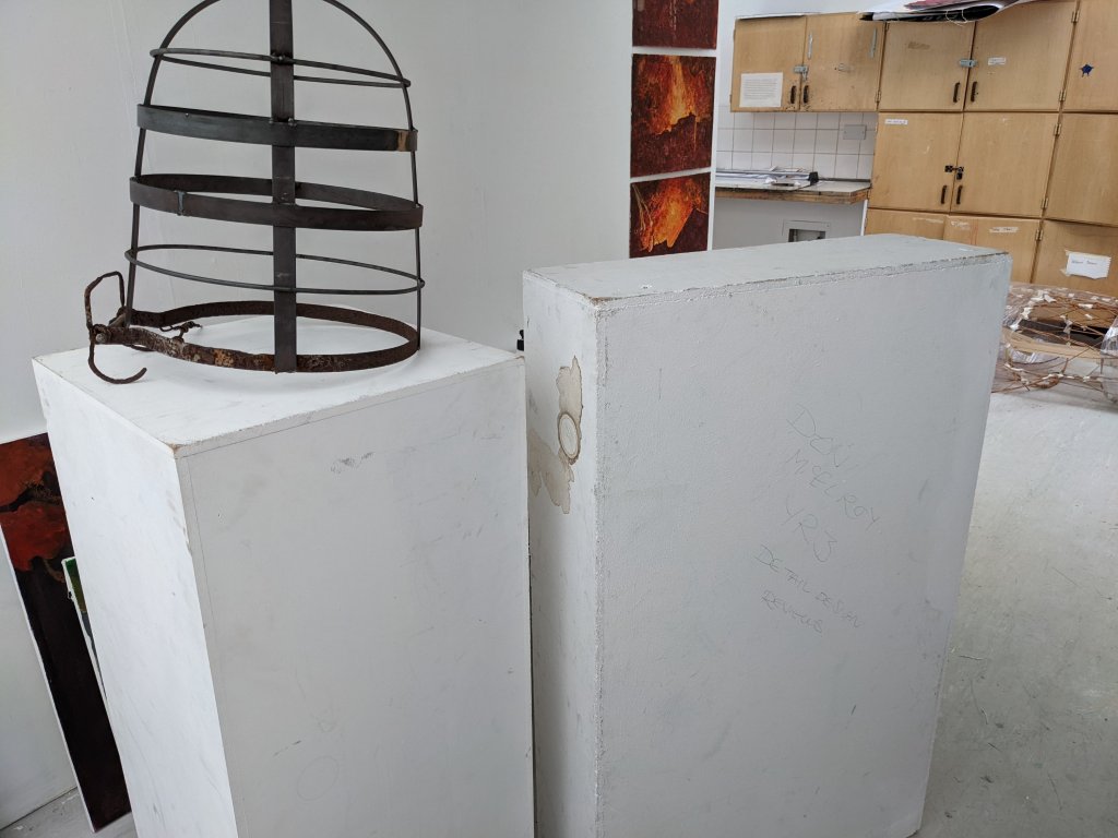 It’s difficult to get a real perspective from this photo alone but I had originally envisioned having the head cage up on a plynth as I felt that it was a very important part of the story so I wanted to draw attention to it but I felt that it would distract from any other found items/sculptures I also found that the other pynths weren’t long enough for the other items particulary the long spear shaped found item.