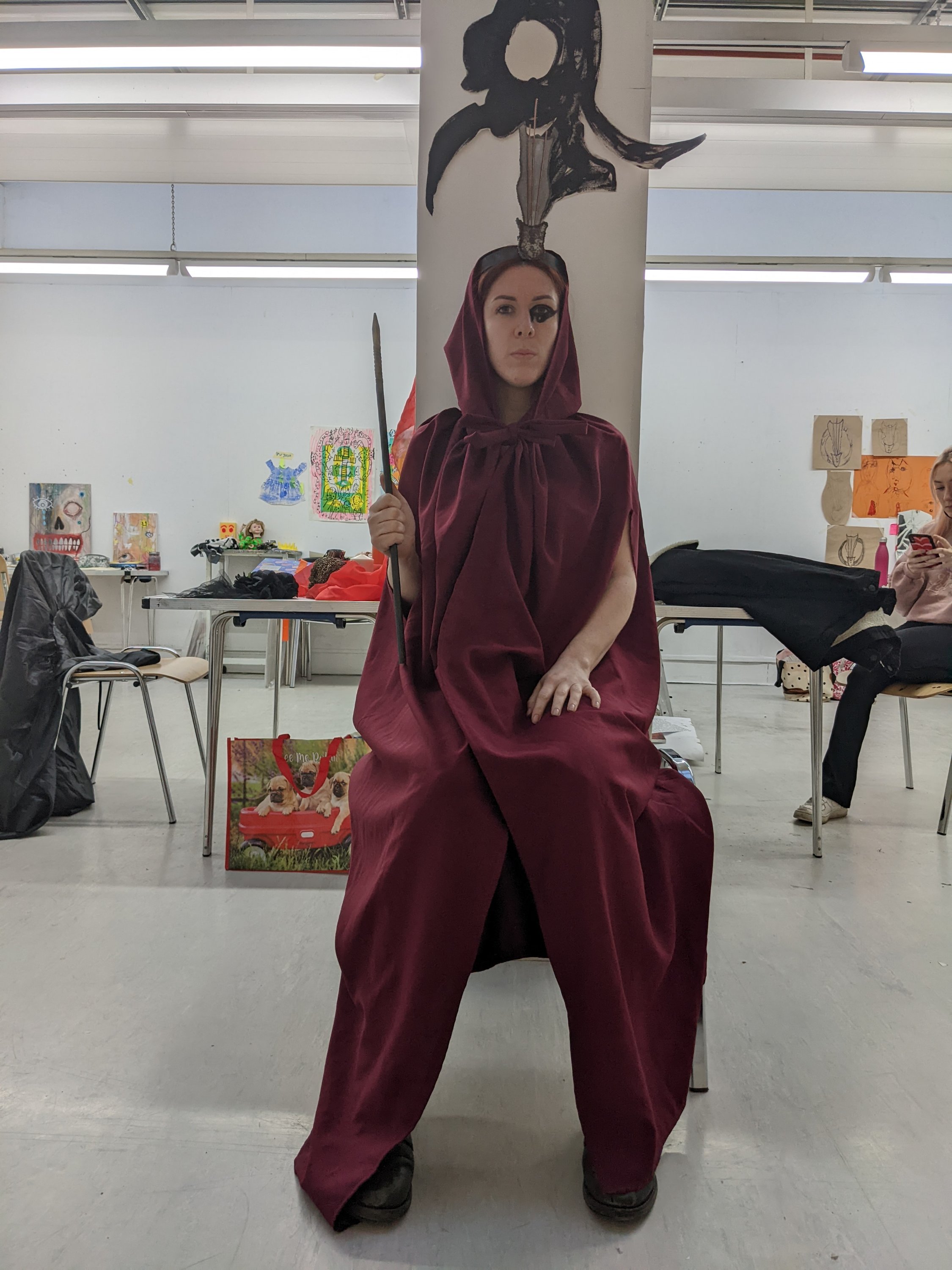 I got asked by a fourth year Claire Gamble if I would want to collaborate with her in a photoshoot which would be shot by a local photographer (Lydia Smith Dundee) as she was making viking styled jewlery and thought it would be a great idea to incorperate the Red Lady’s asthetics with it.So I modeled holding an old book with jewlery on it,a challice with earings in it and a stuffed crow on a branch with jewlerry hanging from the branch.There was a white mark which had appeared on the hood of the cloak which Claire tried to remove with a wet wipe which ended up leaving a wet mark on the hood which the photographer wasn’t happy about.It was decided to tie a shoulder throw made from crow feather around the hood area.I agreed to this altho it doesn’t particualry go with my aethetic.Upon viewing the photo’s afterwards i realised it looked more like hair and I can’t say i was a fan of it but these photo’s were to be used by Claire for her degree work mostly so I didn’t say anything and luckily the wet hood dried for the ‘in character’ shots that I did. I particulary like some shots that were done using red lighting and the ones which were up close to my eyes are it looked like I was going to cry (but really I just had hayfever eyes that day haha).Sadly the photo’s are not yet availible so i’m not able to post them to the blog but hopefully in the future they will be so that I can add them here.