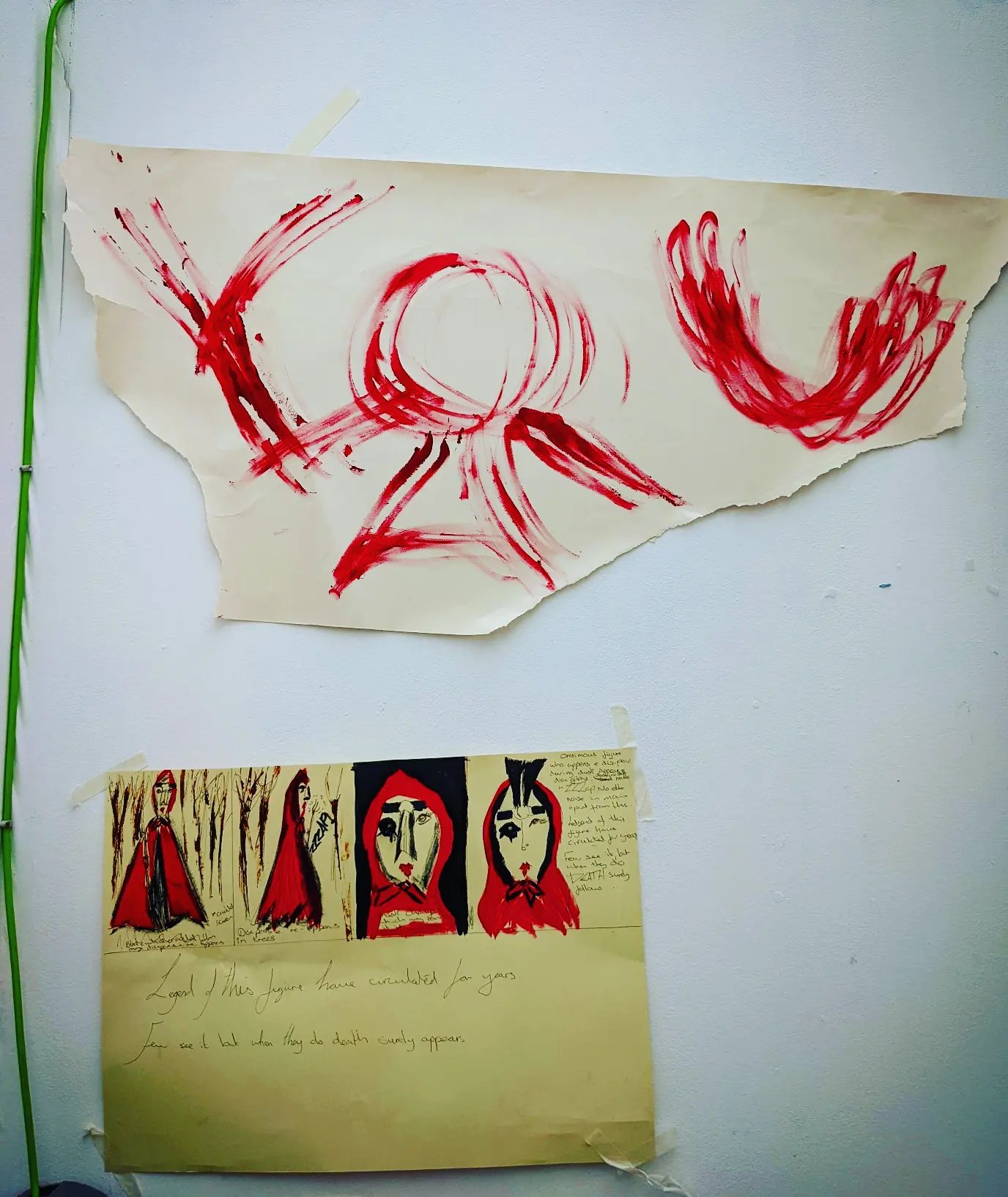 I decided to merge alot of the strong ideas together for the final assesment piece.I took Maria Fusco’s advice and filmed a performance piece where the Red Lady appears and leaves her mark and tell’s her story by making cave-like paintings.I felt that it was important to partially use natural colourings due to the Red Lady’s surrounding being the woods, so I mixed the compost used for the dig in a little water and used a mixture of sticks and an electric cable to paint the images I also mixed the red paint with compost water to give it a darker grungier tone.I also used the cable to scratch in some detail to show frustration,anger and a feeling of being on edge.It also helped with the primitive feel.