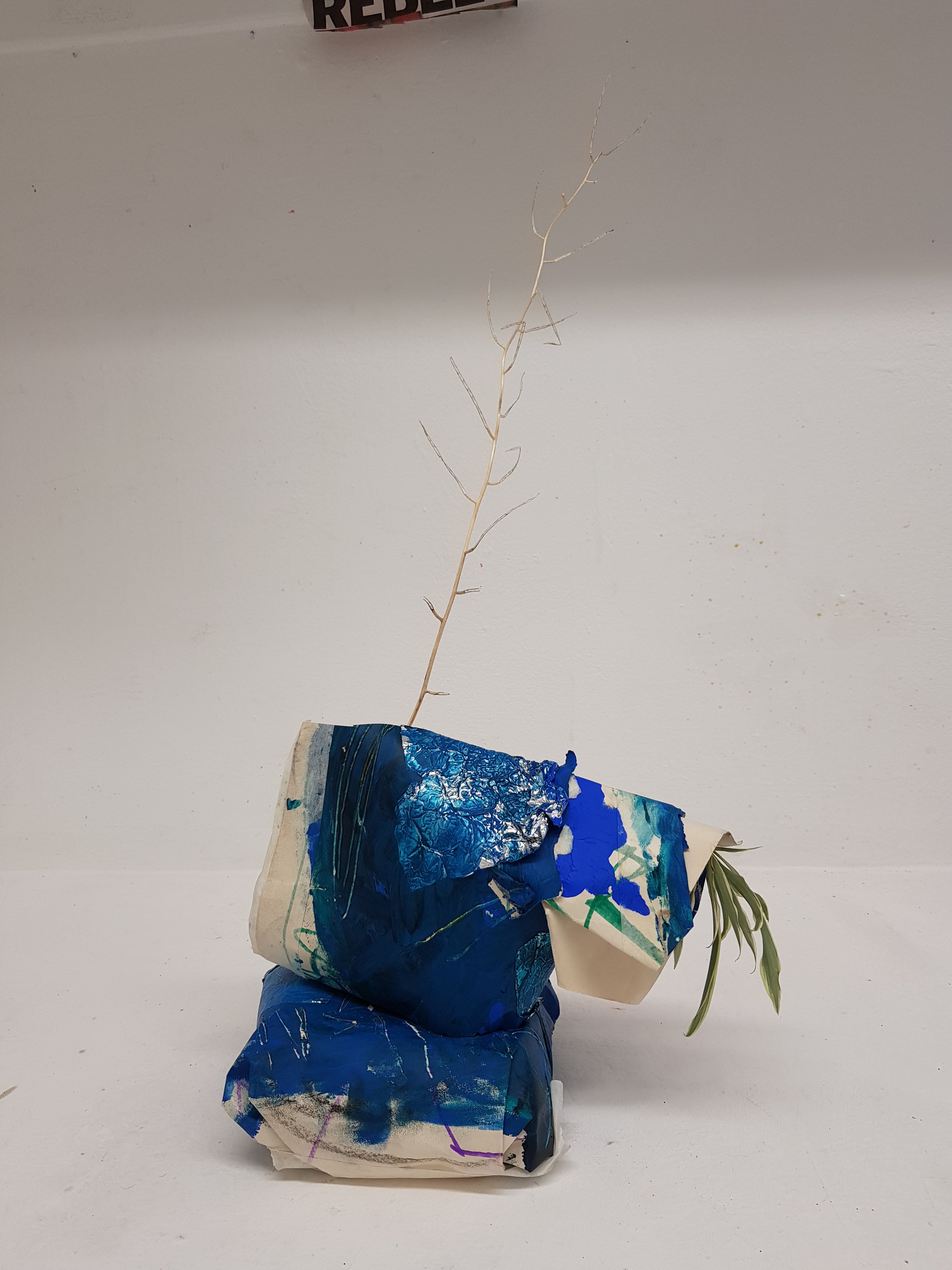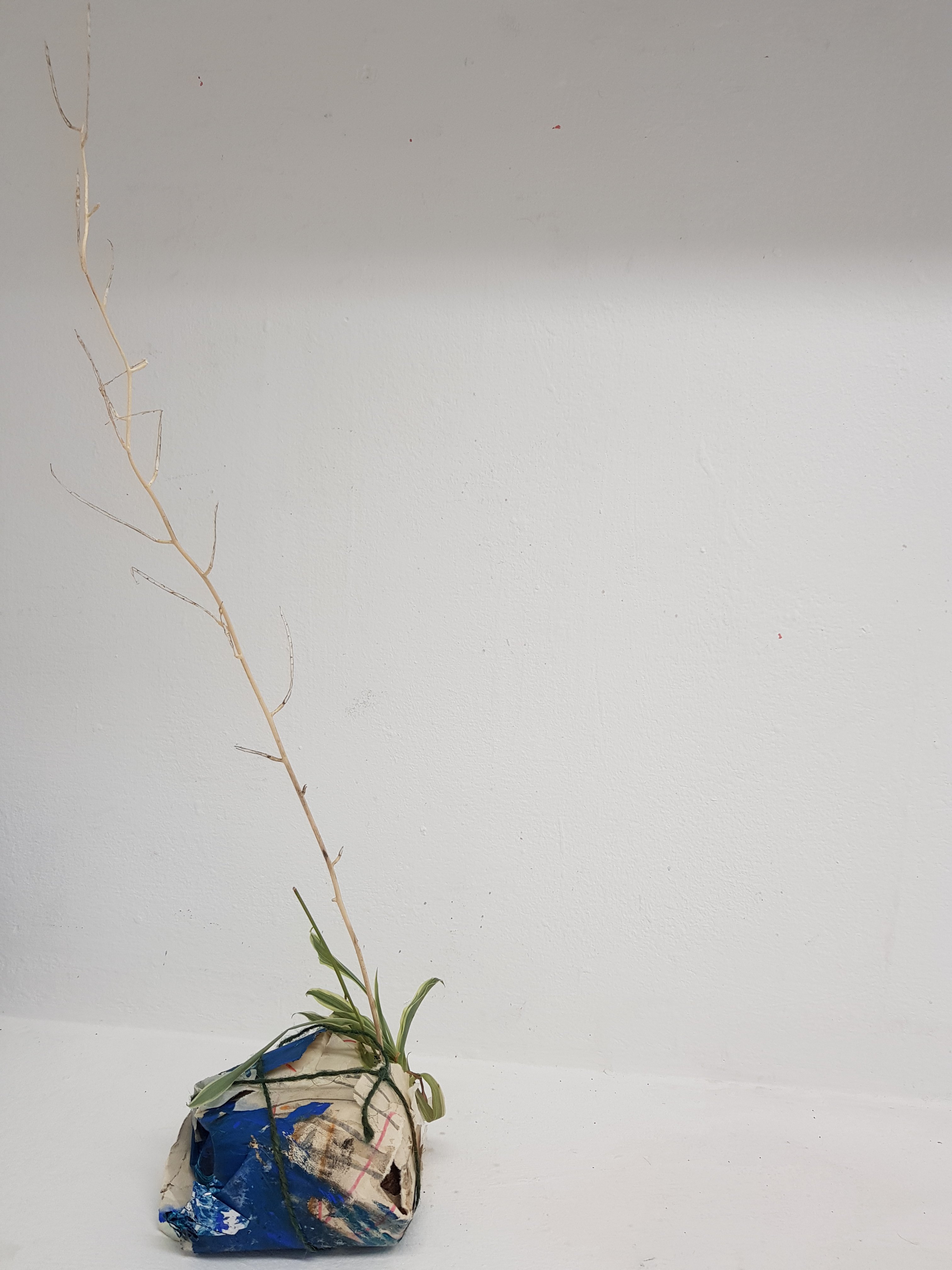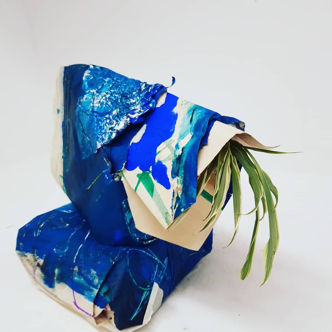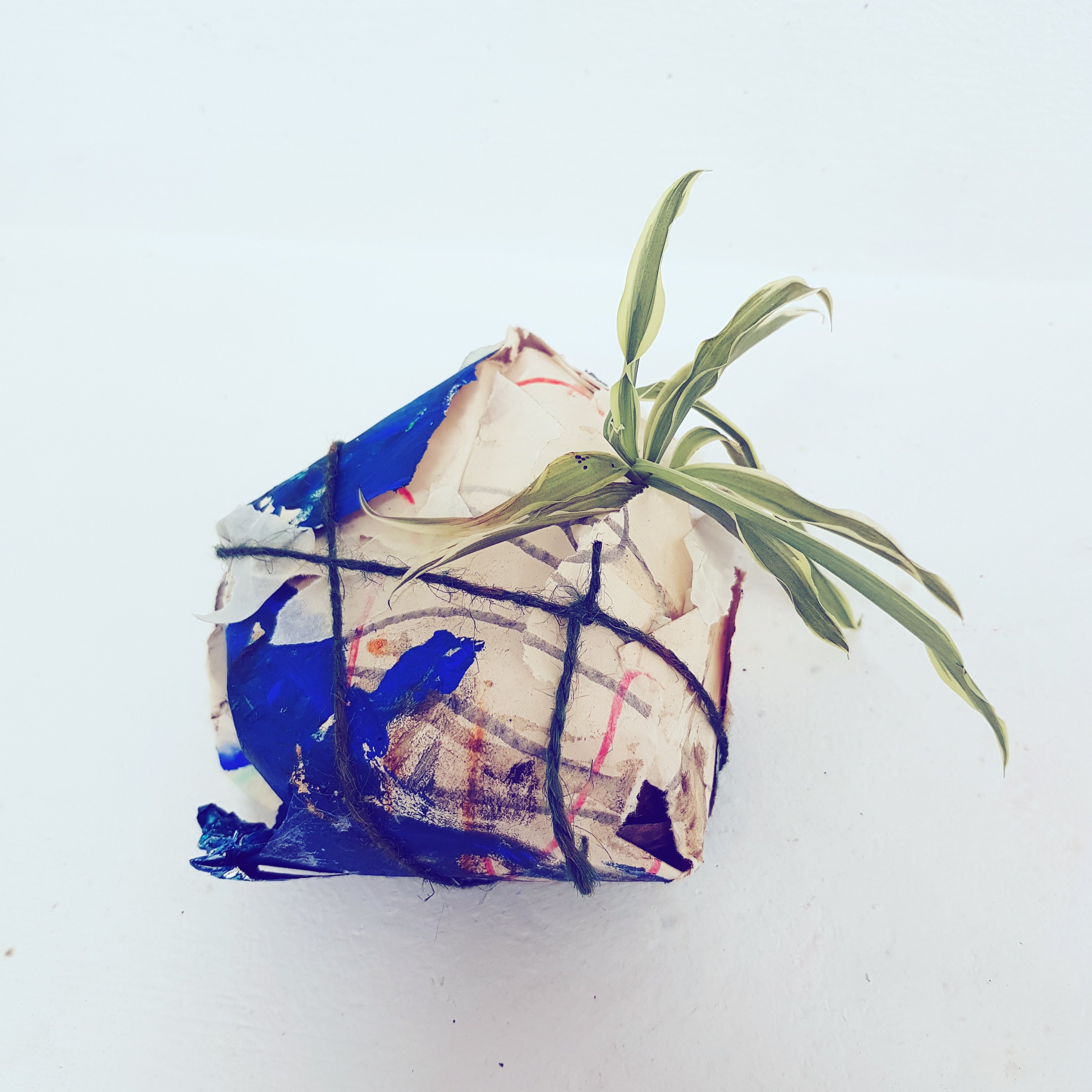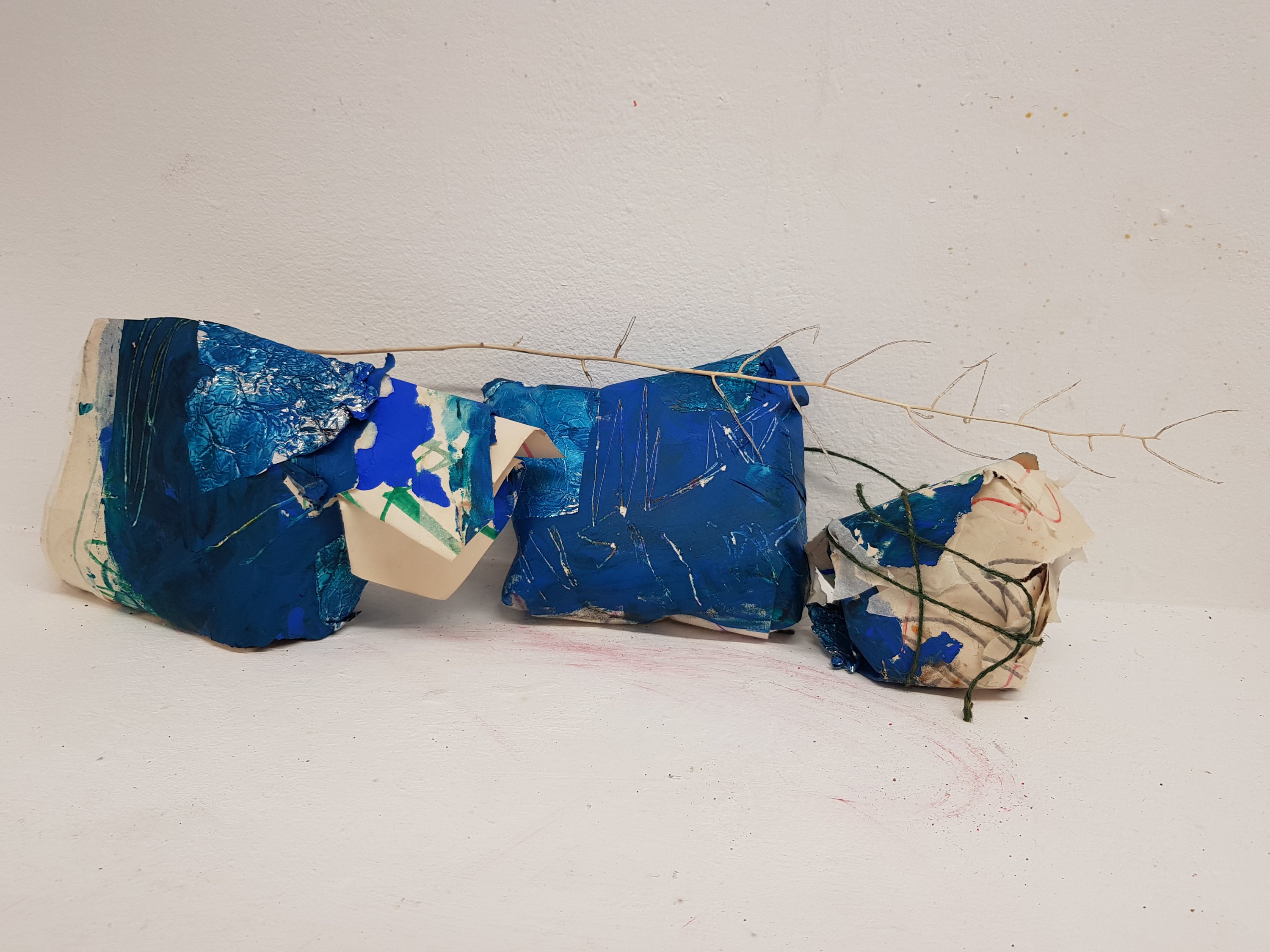I decided to wrap the bricks that i had found in the mixed media painting which had been used previously.I soon found that the parcels started to take on a different form,one looking organic and the other started to become creature/alien like.This is not what I was initally expecting would happen.Placing organic objects in and around the parcels really created quite a nice contrast which i found to be sucessful.