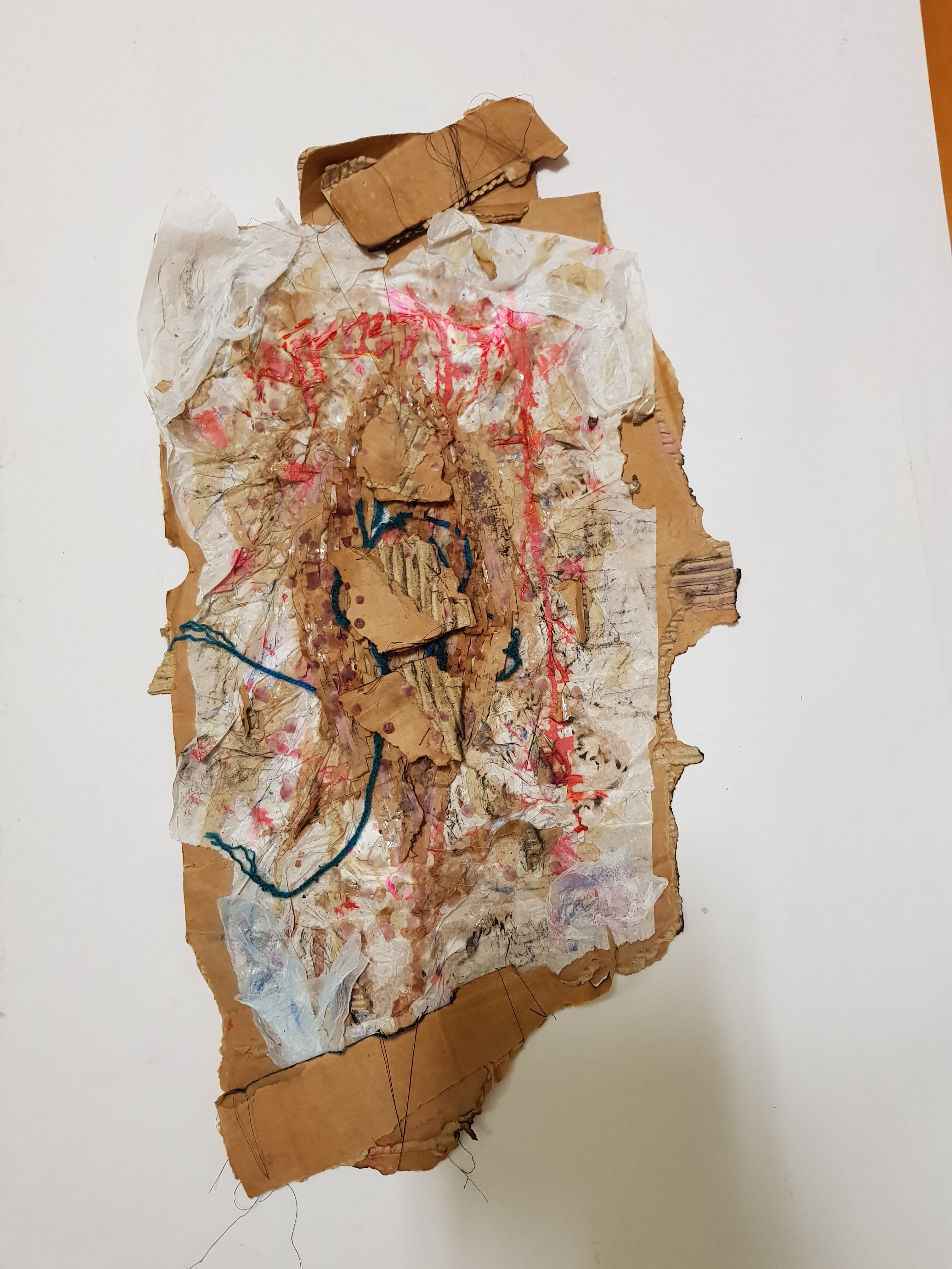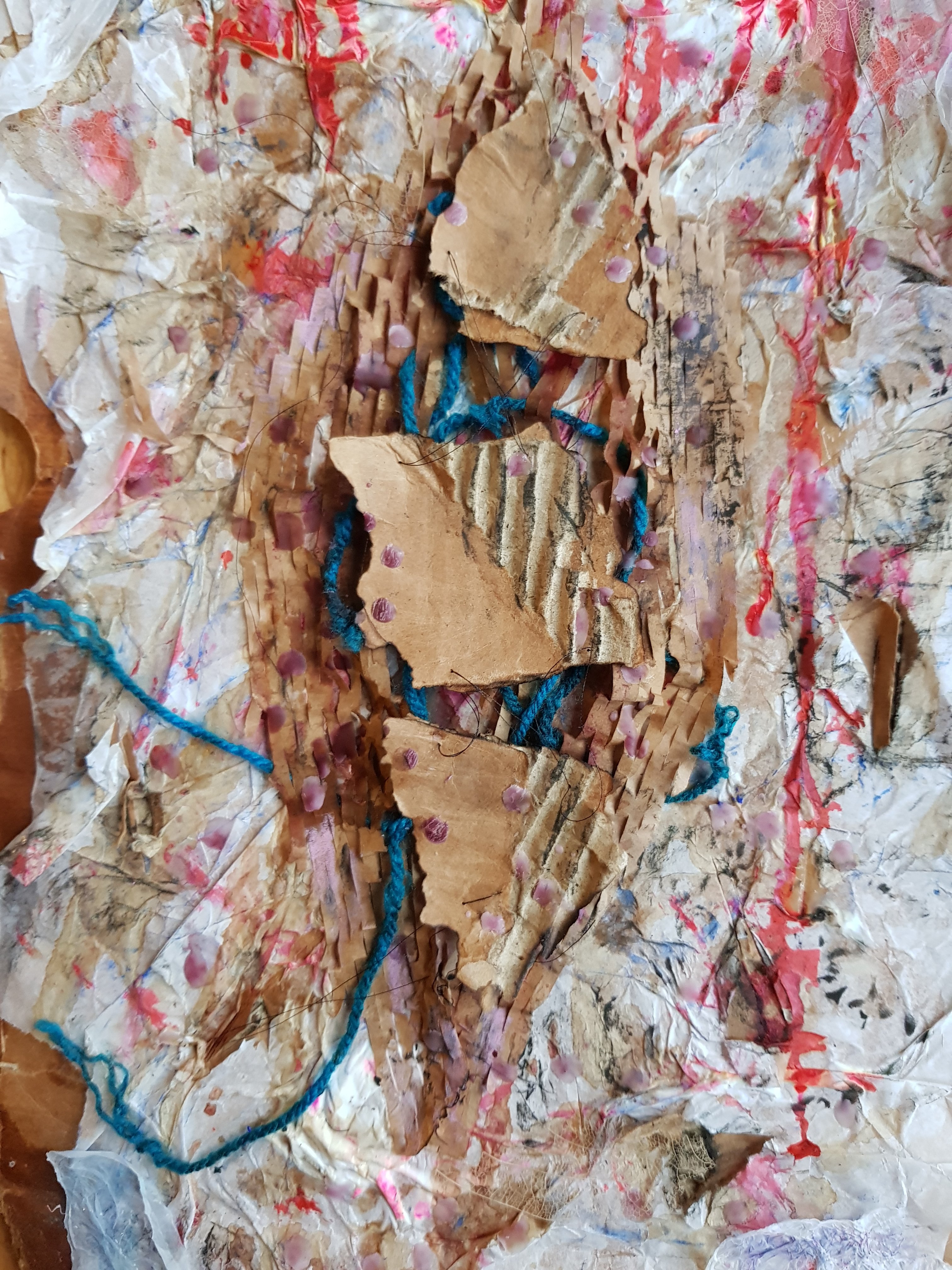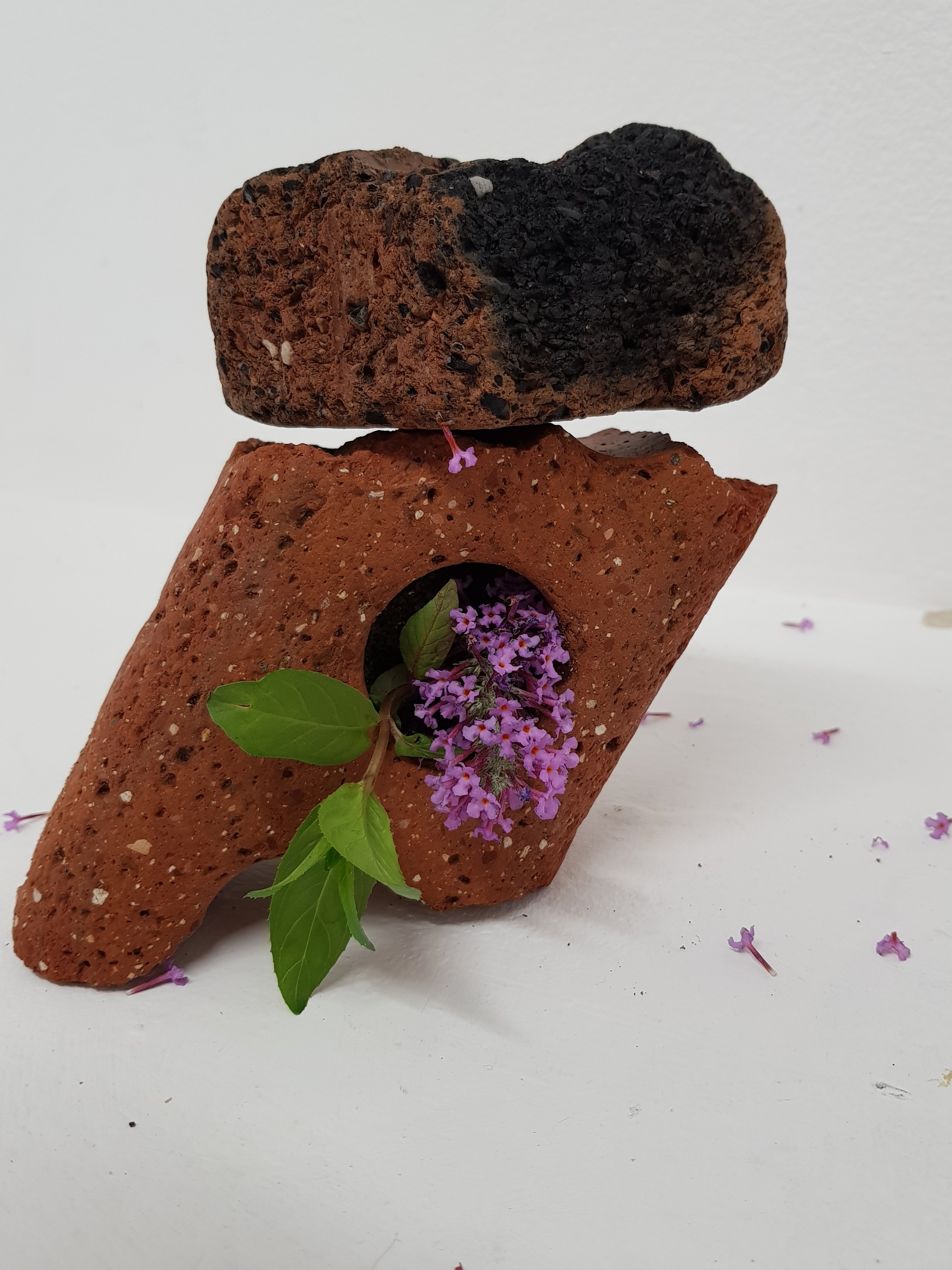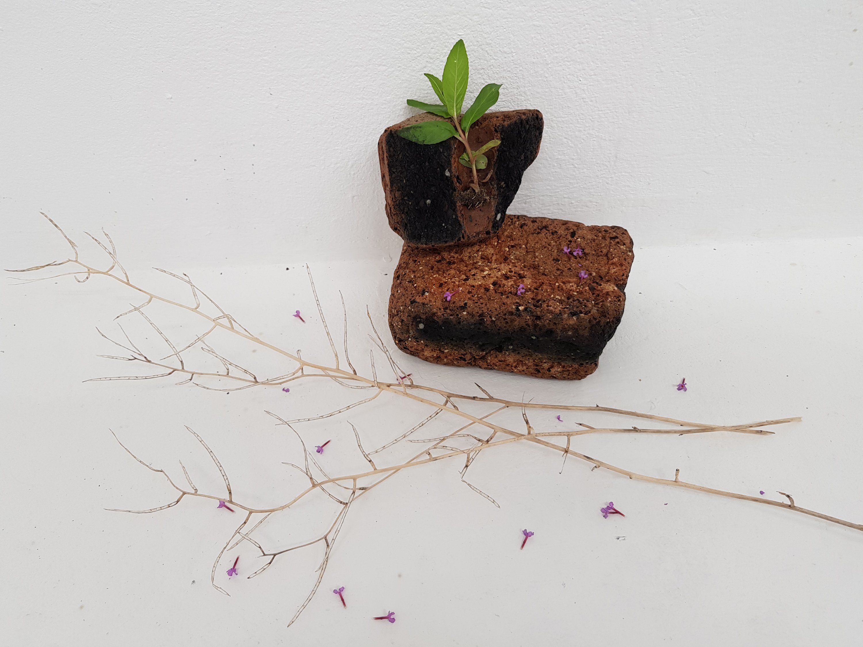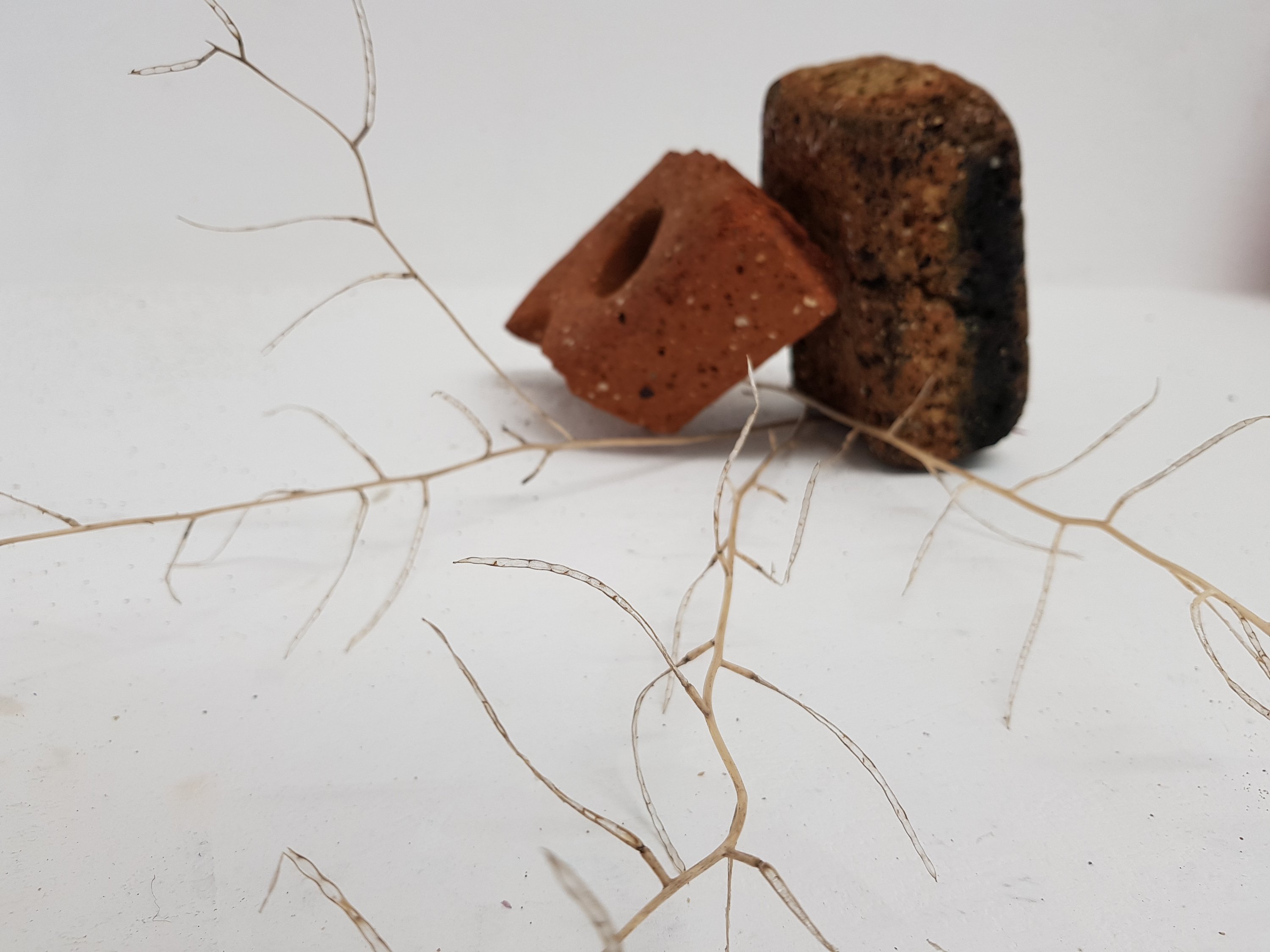 I decided to wrap the bricks that i had found in the mixed media painting which had been used previously.I soon found that the parcels started to take on a different form,one looking organic and the other started to become creature/alien like.This is not what I was initally expecting would happen.Placing organic objects in and around the parcels really created quite a nice contrast which i found to be sucessful.