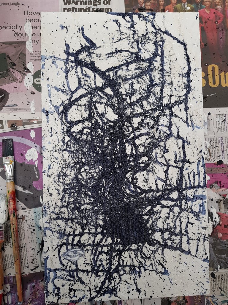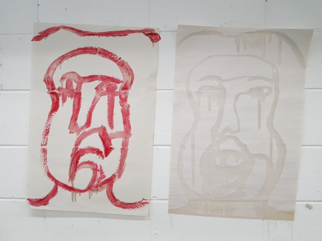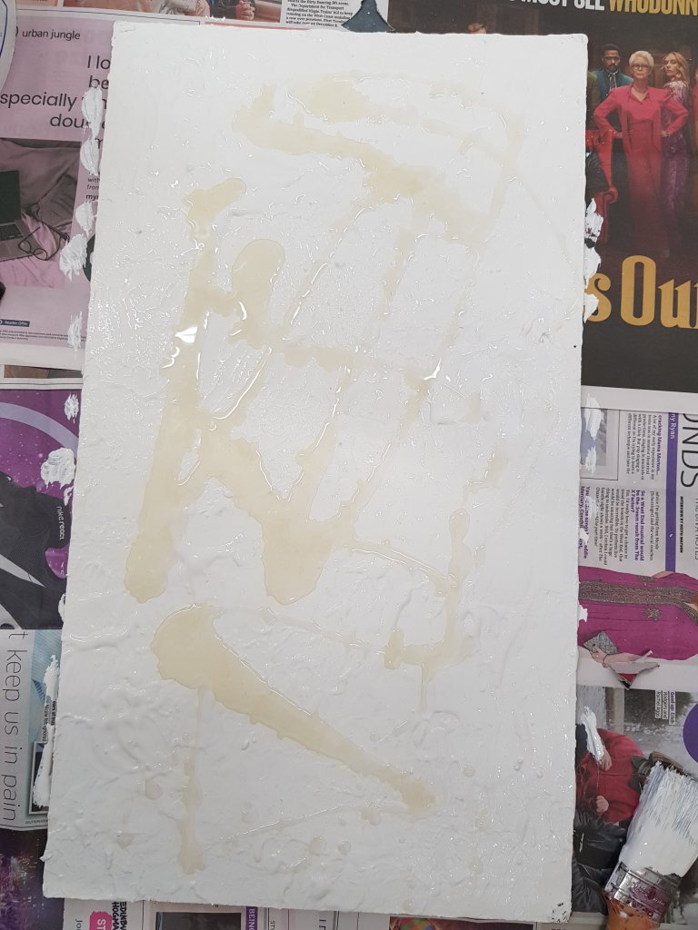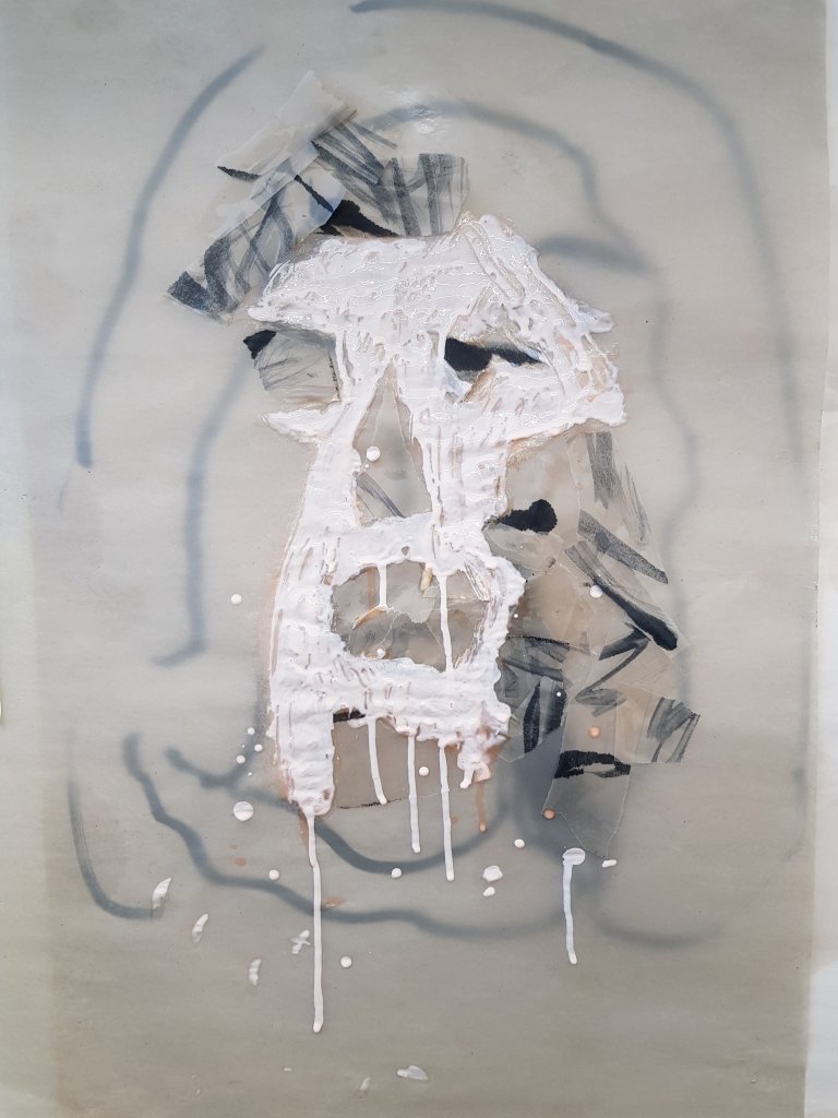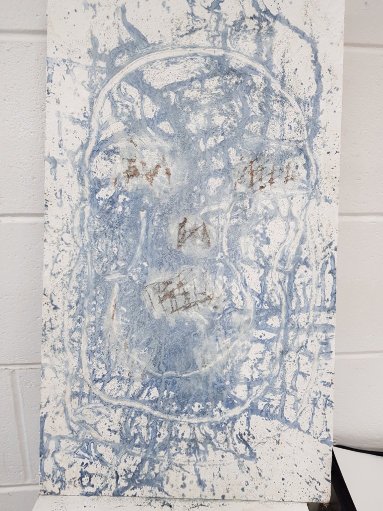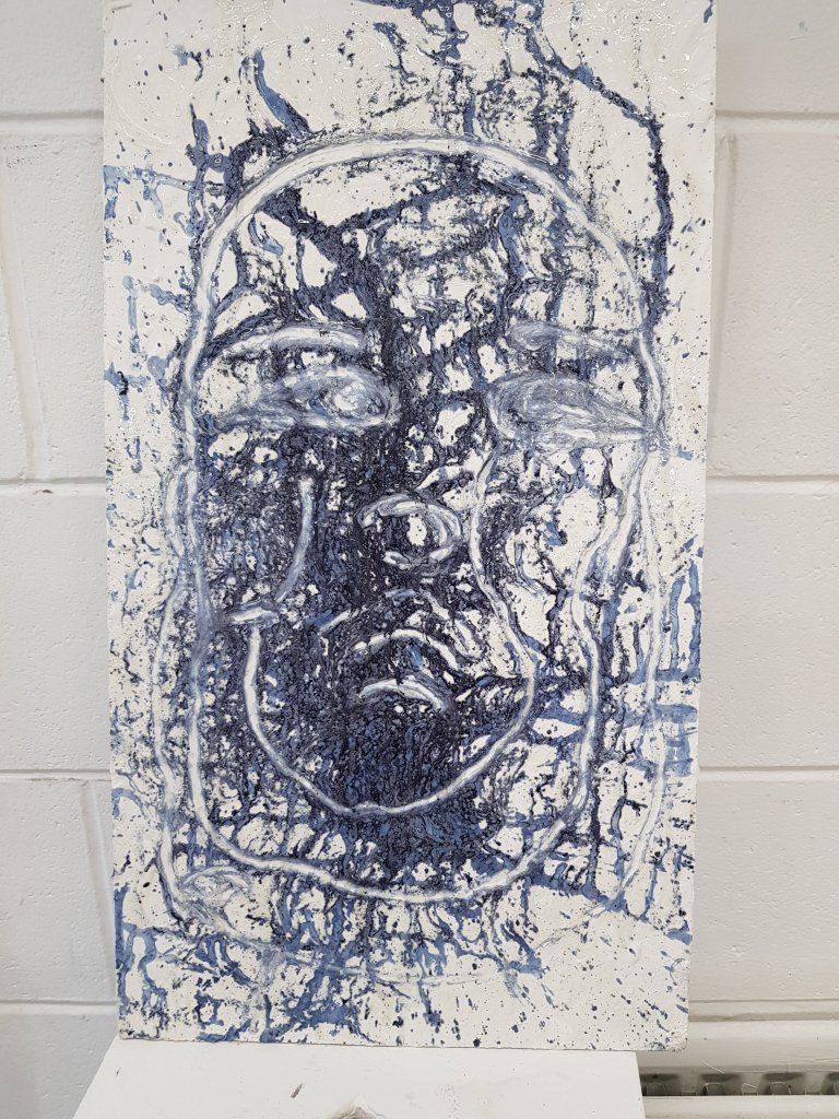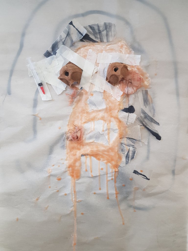 I decided to use layers of emulsion then cooking oil and ink to build up a painting which was originally of Hang Mioku.I liked the way the oil ran with the ink and the consistancy of it.I then decided to deconstruct using a chisel which is an instrument shaped similar to an osteotome use in nose surgery.I then thought of the phrase ‘your eyes are bigger then your belly’ in terms of plastic surgery.The want and need for more and more.So I used egg cartons to suggest this then poured oil into them untill it over flowed (see video).I think i like this piece at certain stages but not at others.Particualy the abstract ink/oil stage and when i had freshly scratched into it.I wonder if this is the same feeling people have at particular stages in surgery?I also can’t say that i feel a strong like or dislike towards this piece which i am still trying to figure out why