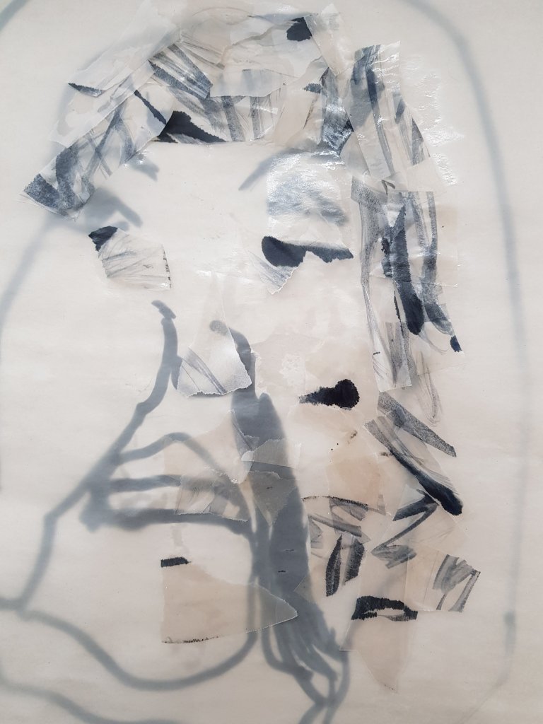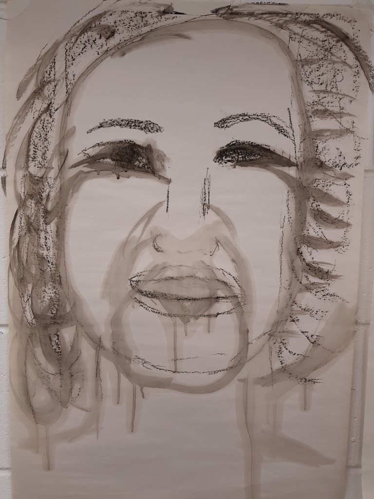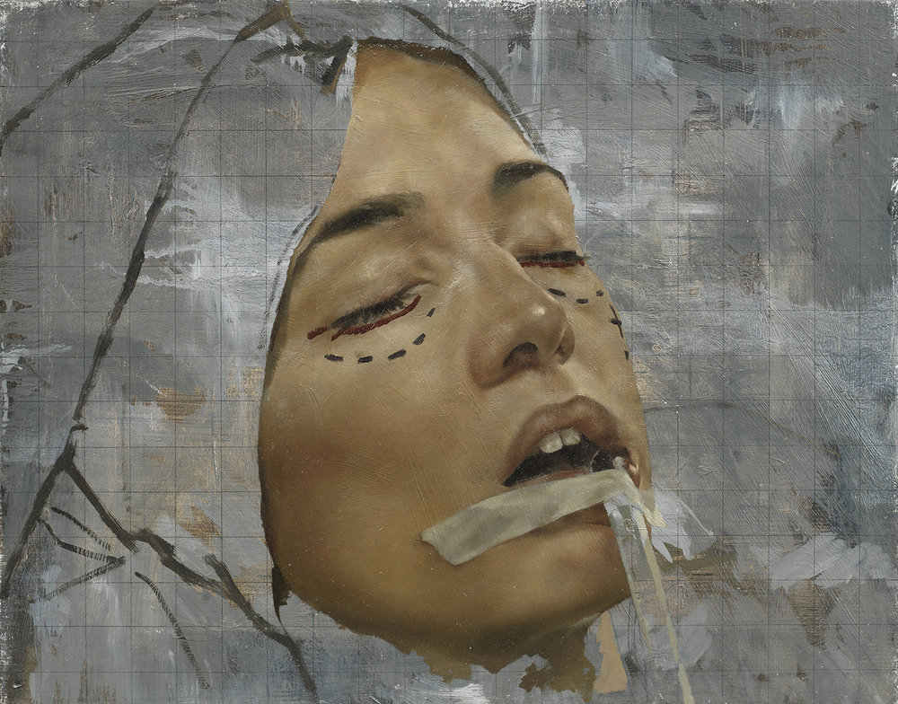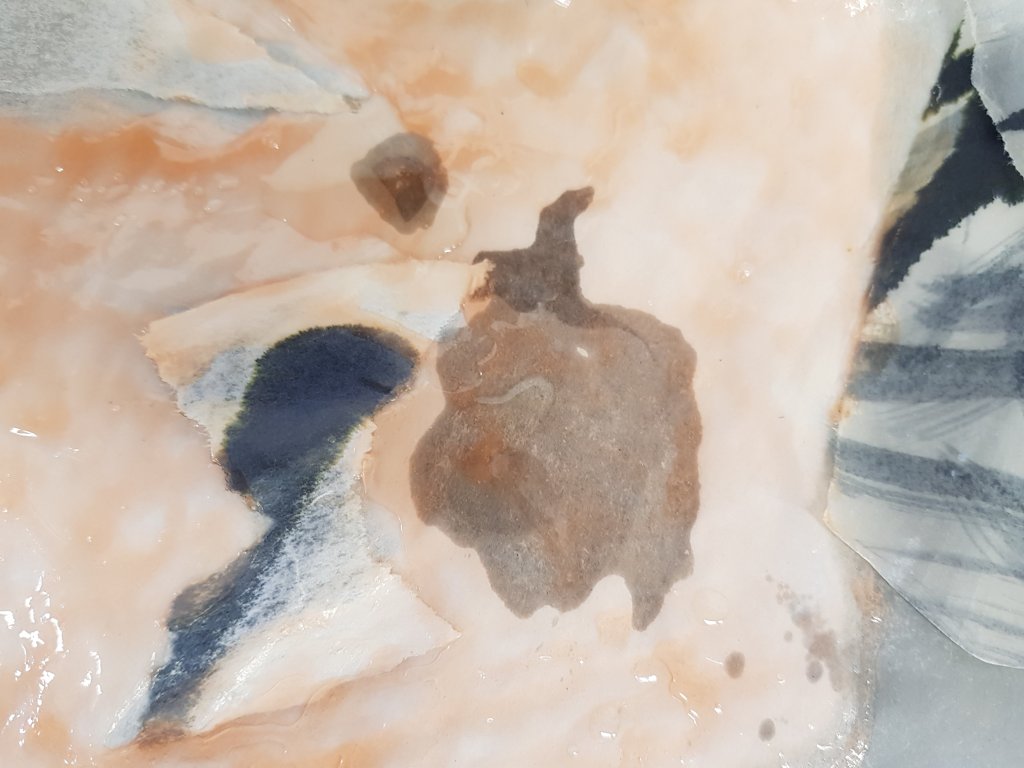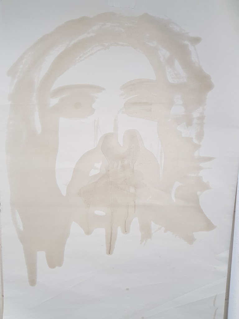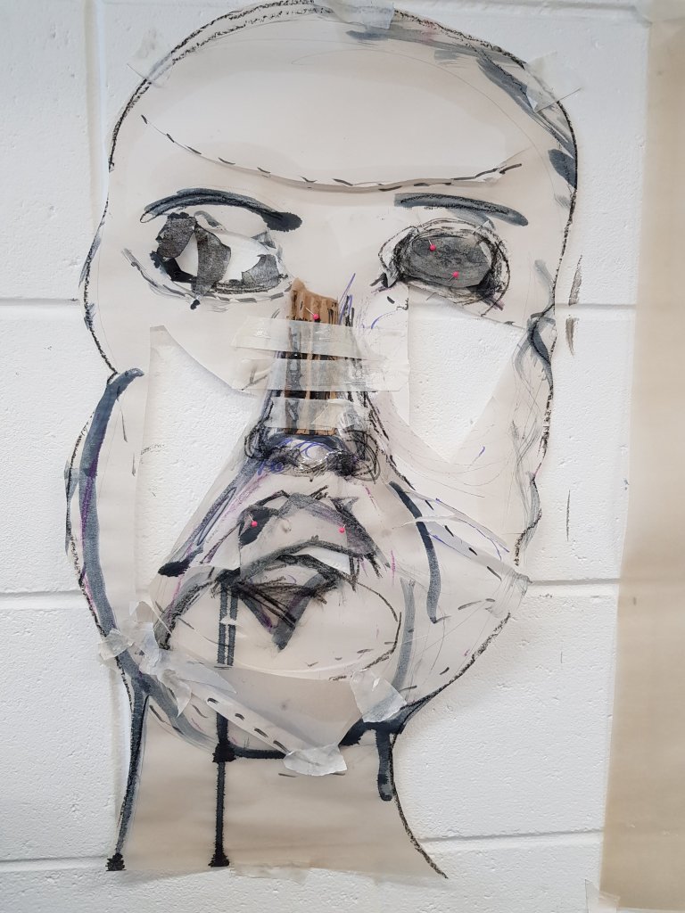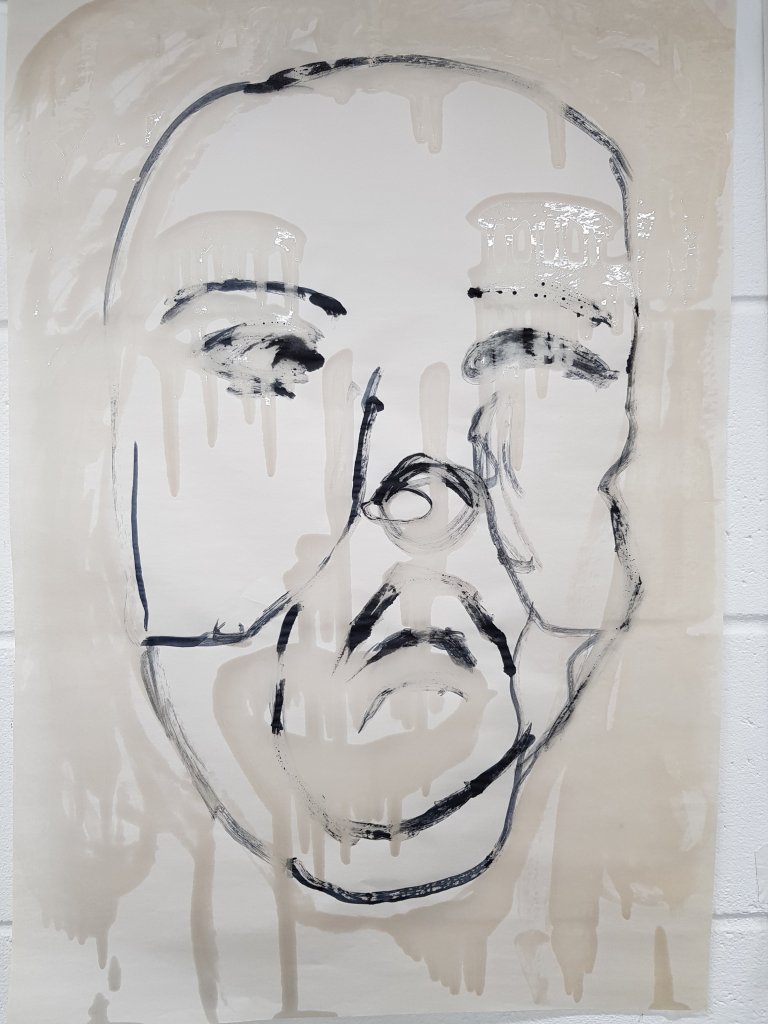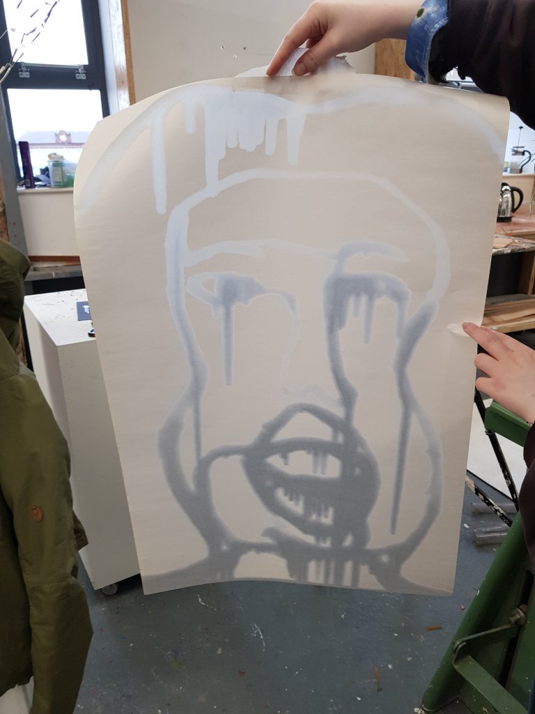 I decided to use layers of emulsion then cooking oil and ink to build up a painting which was originally of Hang Mioku.I liked the way the oil ran with the ink and the consistancy of it.I then decided to deconstruct using a chisel which is an instrument shaped similar to an osteotome use in nose surgery.I then thought of the phrase ‘your eyes are bigger then your belly’ in terms of plastic surgery.The want and need for more and more.So I used egg cartons to suggest this then poured oil into them untill it over flowed (see video).I think i like this piece at certain stages but not at others.Particualy the abstract ink/oil stage and when i had freshly scratched into it.I wonder if this is the same feeling people have at particular stages in surgery?I also can’t say that i feel a strong like or dislike towards this piece which i am still trying to figure out why