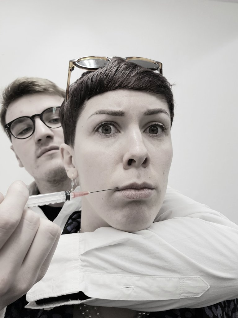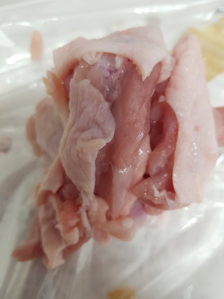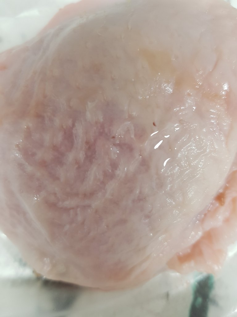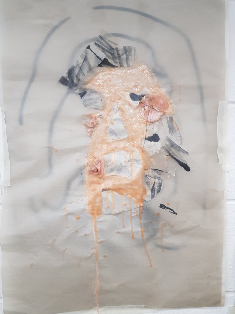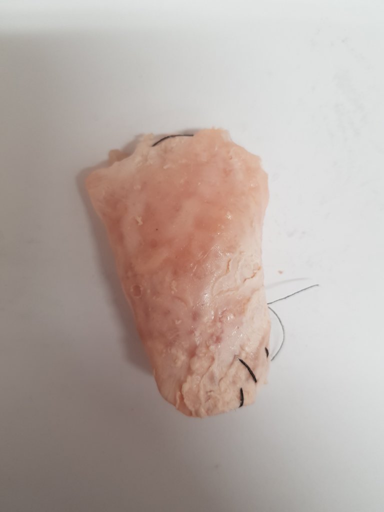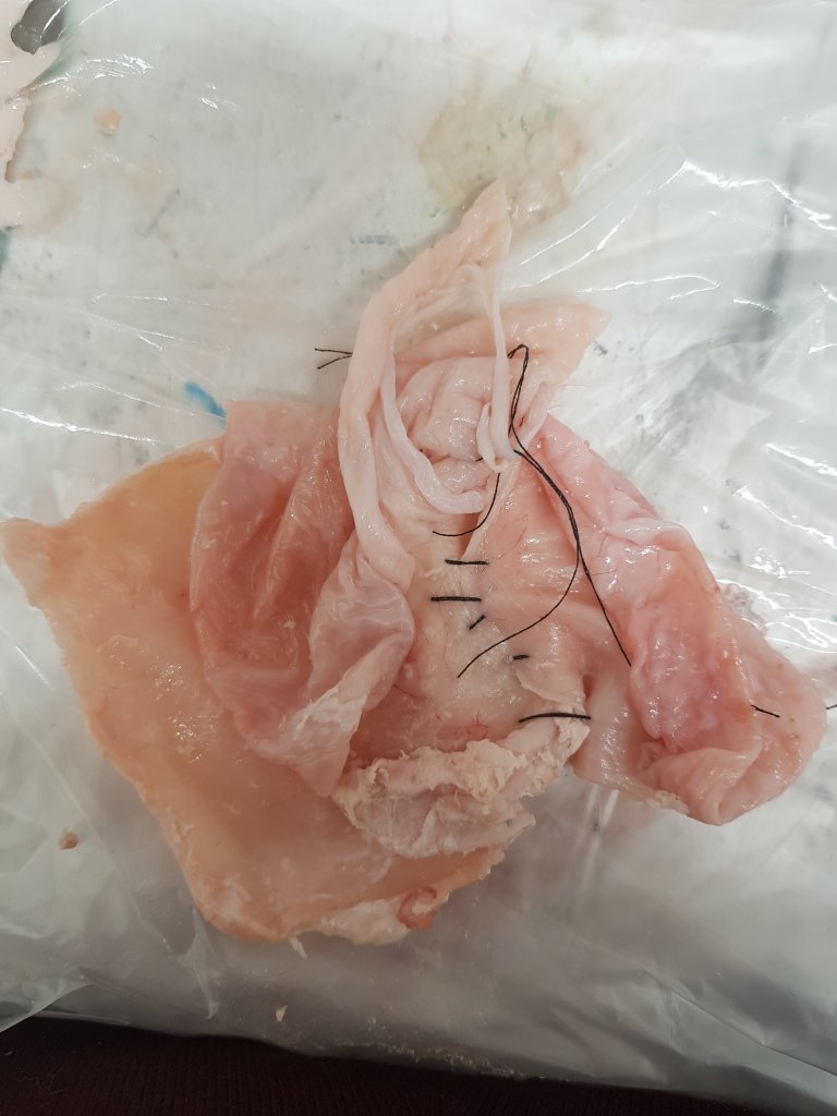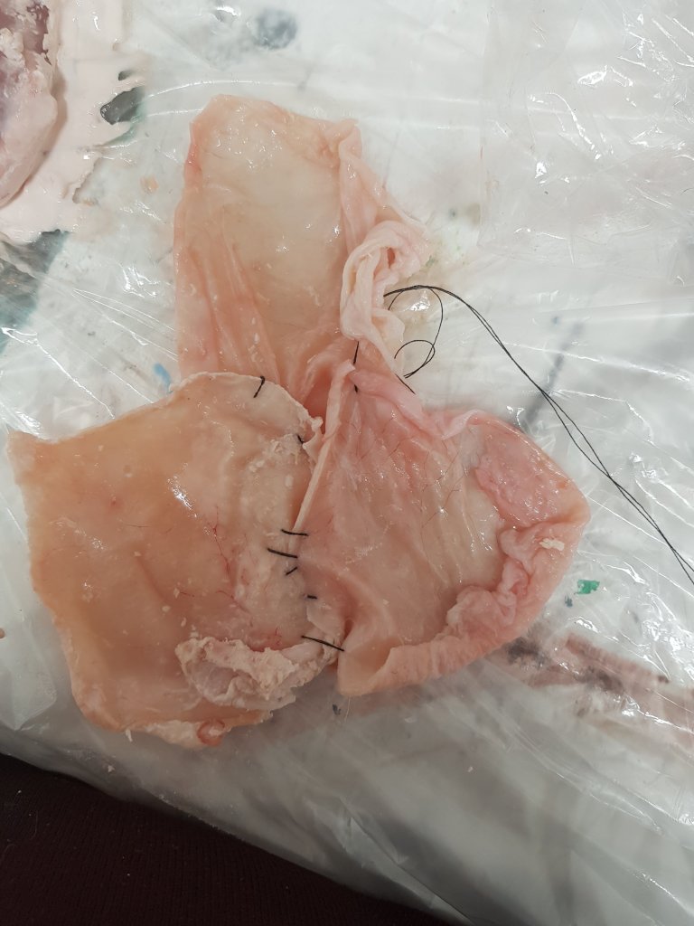 I decided to sew the skin together to give the effect of human skin.I loved the visual effect of how the skin looked slimey and grotesque and also how the inside of the chicken skin was similar to that of human flesh.I also liked the connection between ‘the butchers’ on the chicken pack and how people are basically butchered during botch plastic surgery jobs.