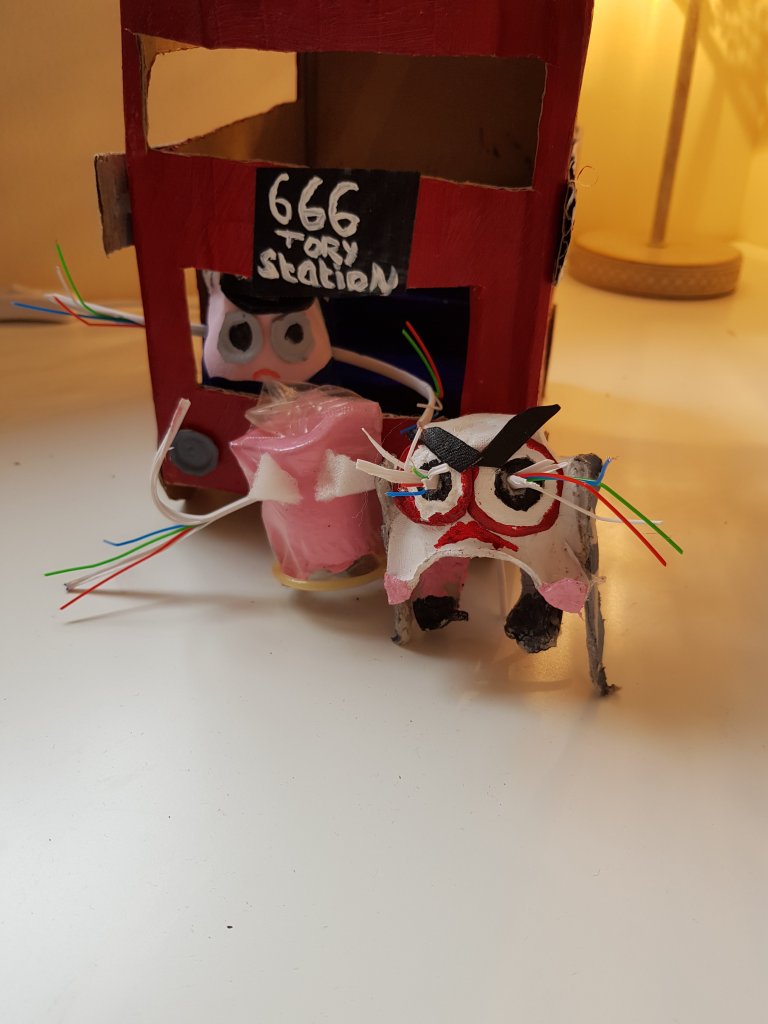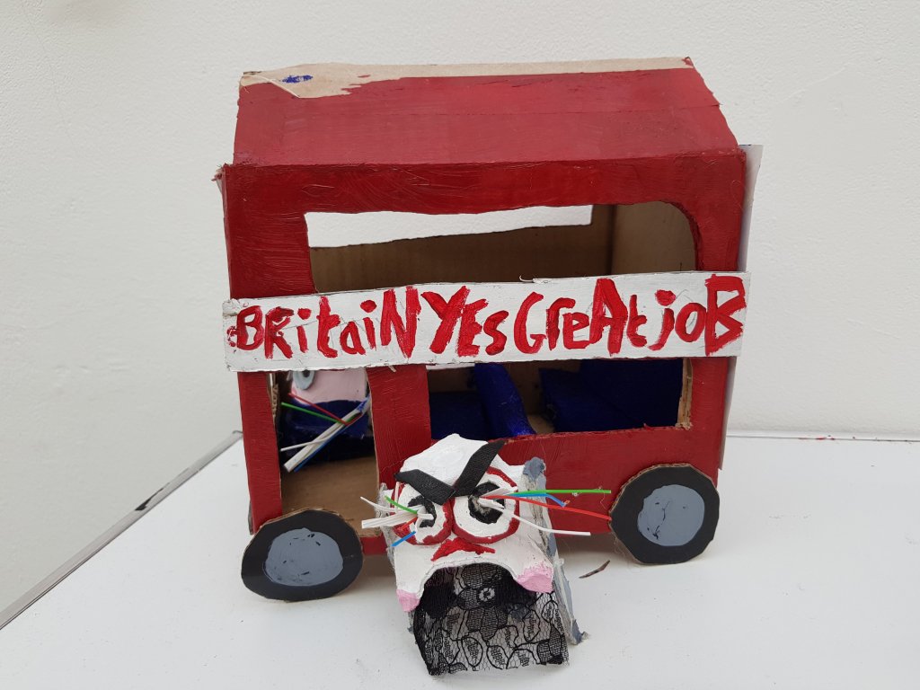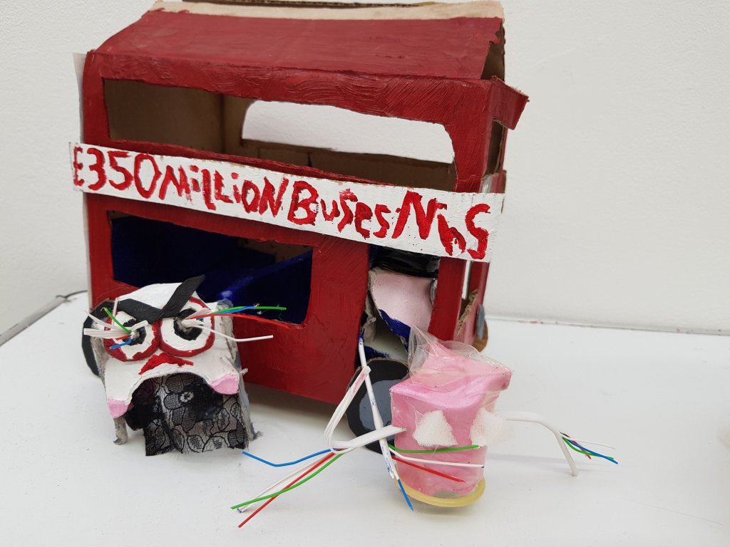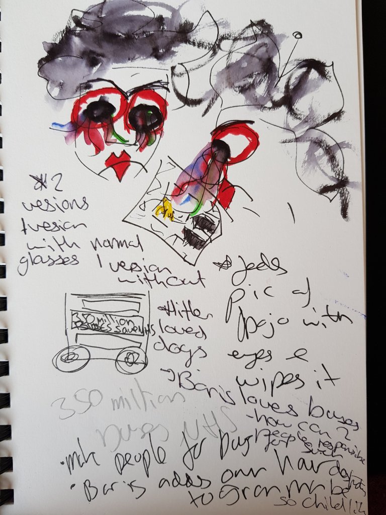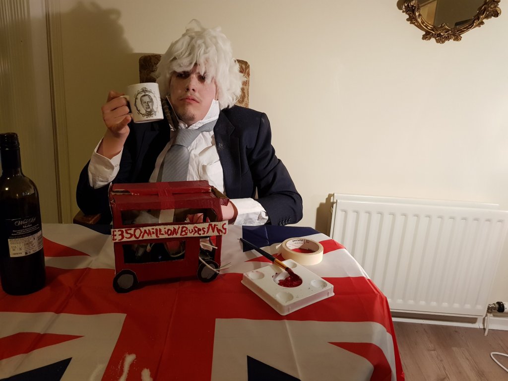 Following on from last weeks prop making I started filming ‘Bojo’s buses’. I had originally planned on having the union jack on the wall behind Bojo but realised that it was better placed as a table cloth as it being behind Louis was far to distracting and almost visually ‘drowned him out.’I decided to have part of my quite regal looking mirror in the background as a sign of grandeur and have him sat on quite a country looking chair which occurs in the ‘batshit crazy old lady’ video’s.